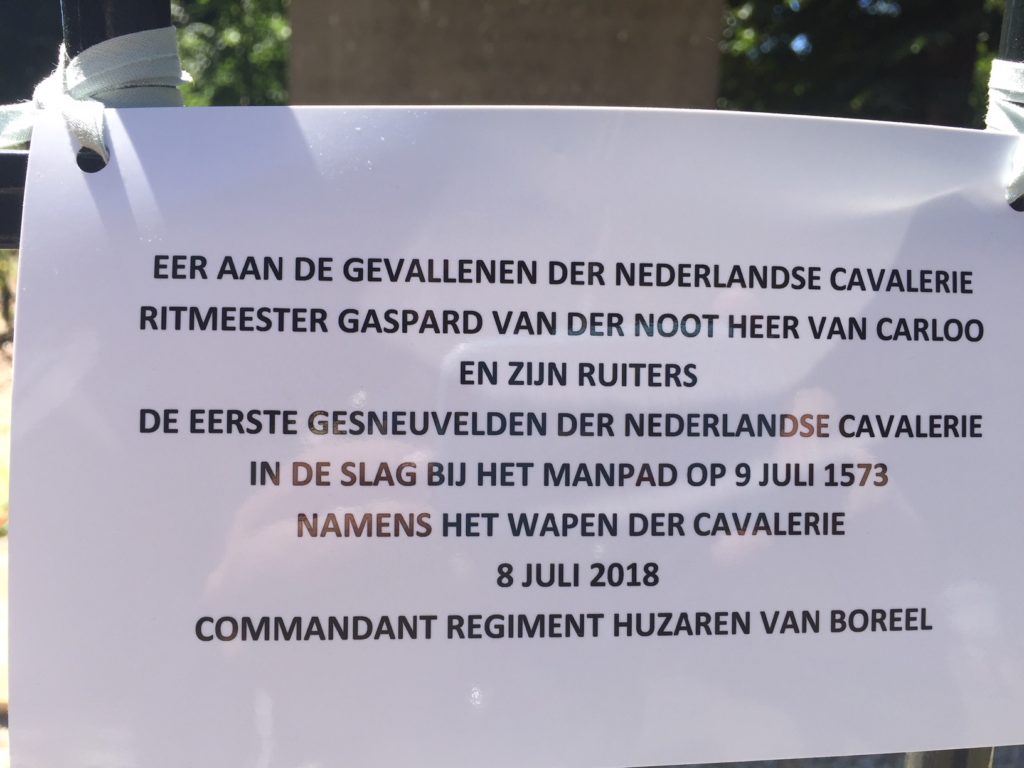 Op 8 juli is in Heemstede door een aantal cavaleristen met een korte plechtigheid en bloemstuklegging de Slag in het Manpad herdacht. Deze slag vond plaats in 1573 bij een poging tot ontzet van Haarlem tijdens de Tachtig Jarige Oorlog. Bij deze slag sneuvelde ondermeer de leider van de eerste Nederlandse Cavalerie eenheid, Caspar van der Noot. Casper van der Noot had enkele maanden daarvoor schriftelijke opdracht gekregen van Prins Willem van Oranje om een Nederlandse ‘vaan’ met ruiters op te richten. De dagtekening van deze brief geld min of meer als oprichtingsdatum van de Nederlandse cavalerie. De aanwezige cavaleristen waren de RegimentsCommandant Regiment Huzaren van Boreel kolonel Hans van Dalen, de regimentsarts RHB KLTZ Jaap Boreel, lkol tit bd Willem Plinck en ritm bd Axel Rosendahl Huber. Ook waren vertegenwoordigers van de Heemkundige Kring Heemstede en plaatselijke media aanwezig.