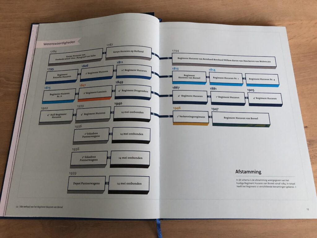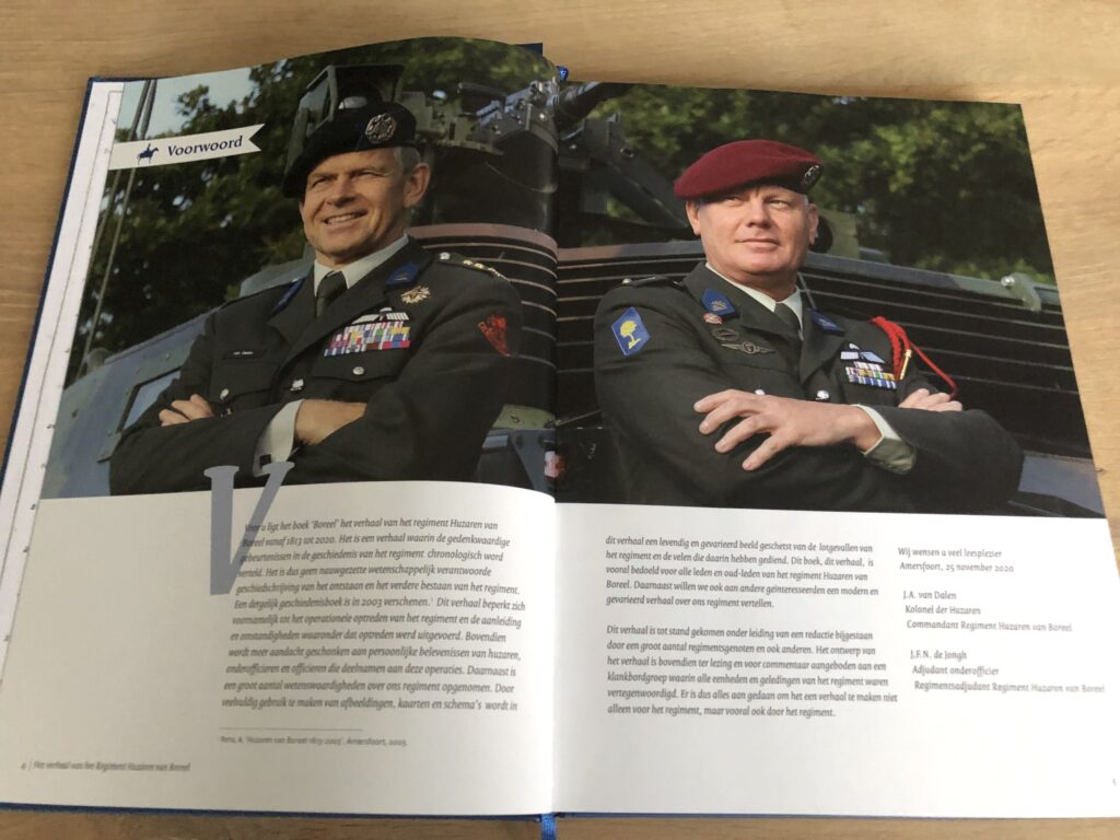Het vernieuwde regimentsboek geeft inzicht in de geschiedenis van het op 25 november 1813 opgerichte huzarenregiment. Het boek is modern van opzicht en rijkelijk geïllustreerd, met zowel schilderijen, foto’s en zelfs strips. De diverse periodes van het regiment worden chronologisch behandeld, afgewisseld met vignetten waarin wetenswaardigheden van het regiment of de cavalerie in algemene zin worden toegelicht.