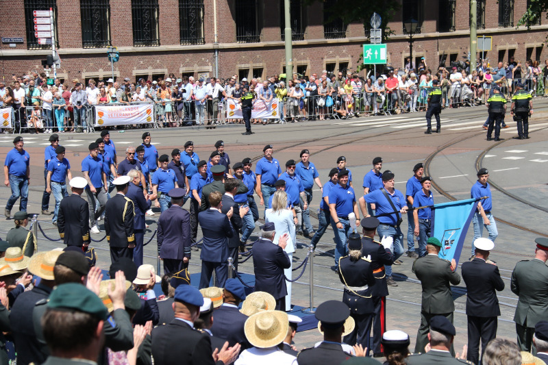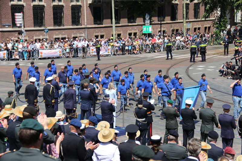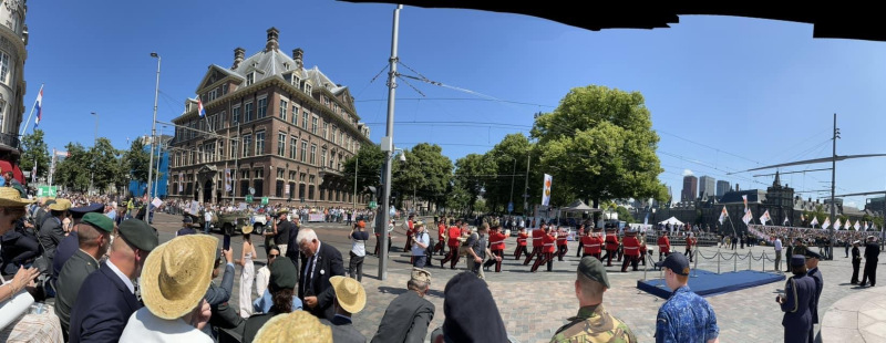 Ons detachement vertrok vanaf de Koekamp richting de Kneuterdijk, waar koning Willem-Alexander hen afzwaaide (video) in aanwezigheid van minister van Defensie Kajsa Ollongren en de Commandant der Strijdkrachten, Onno Eichelsheim. Voor het eerst kwamen de 4000 militairen en veteranen via een baileybrug het Muziekplein binnen, waar ze werden welkom geheten met muziek van onder andere onze Fanfare Bereden Wapens en vooral applaus. Ondanks de hitte stonden de bezoekers massaal langs de route van het defilé om de detachementen te aanschouwen en eren.