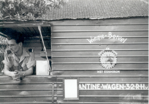 De cantinewagen van het 3e Eskadron 2e Afd. Regiment Huzaren van Boreel verzorgt de huzaren op Oost-Java, tijdens een sportdag te Lawang, 1949.