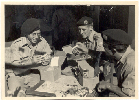 Middelste militair, een wachtmeester, heeft op zijn linkermouw het metalen RHvB-embleem