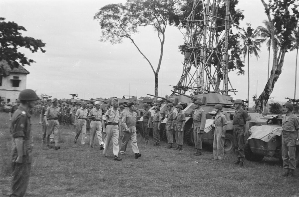 De inspectie van de aangetreden troepen van het 2e Eskadron Pantserwagens . Voorop loopt de commandant T-Brigade kolonel D.R.A. van Langen en de corpscommandant majoor F. Rouffaer op 25 november 1947