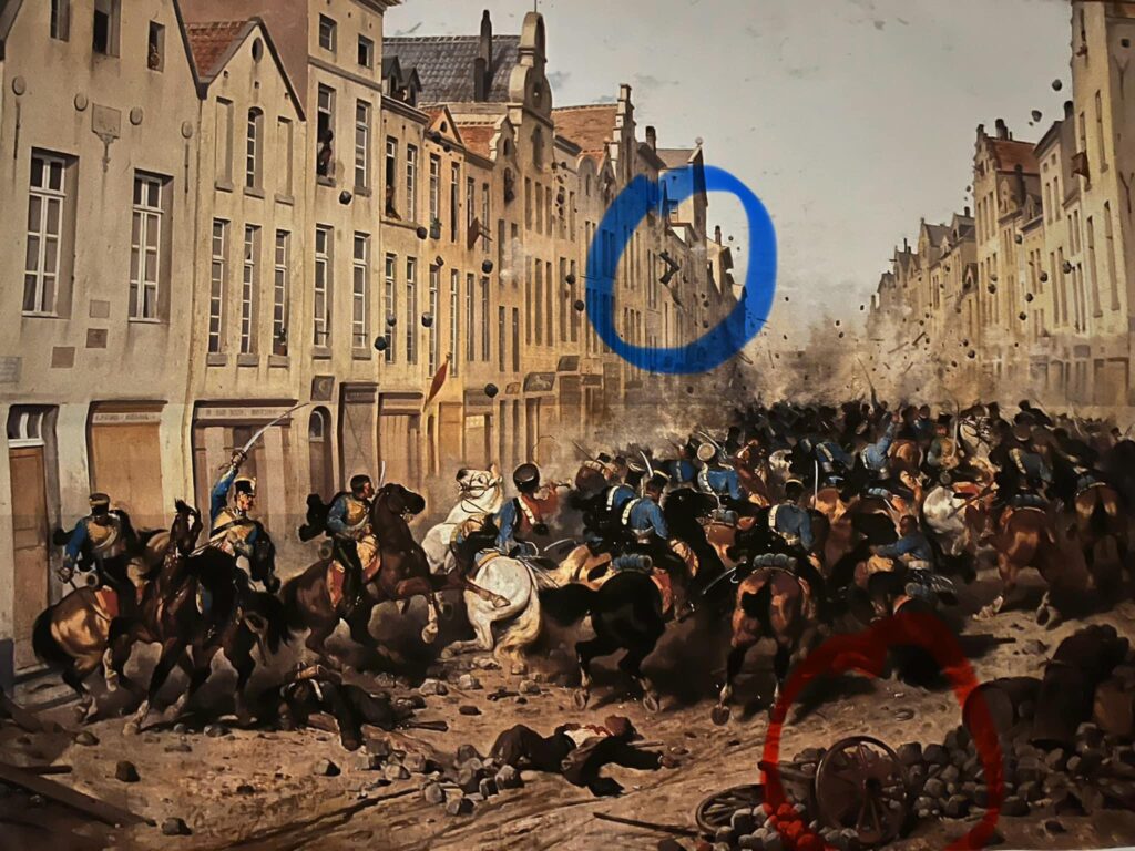 We hebben een mooi cadeau van onze Belgische kameraden gekregen, namelijk ons oude verloren gegane wagenwiel uit 1830. Ooit vergeten mee terug te nemen tijdens onze glorieuze intocht in Brussel. Het wiel (de rode cirkel op het schilderij) stond nog als oorlogsschat in het Belgische Nationale Museum.