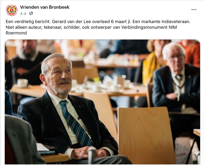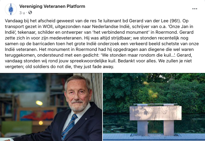 Met het afscheid van Gerard van der Lee is een markante veteraan heengegaan. Iemand die in het publieke debat over het militair optreden in voormalig Nederlands-Indië op correcte en genuanceerde wijze voor de eer en belangen van zijn sobats opkwam en zijn manier van verwerking van zijn missie op papier, op doek, op een ‘Verbindend Monument’ (foto) en in een boek voor ons heeft achtergelaten.