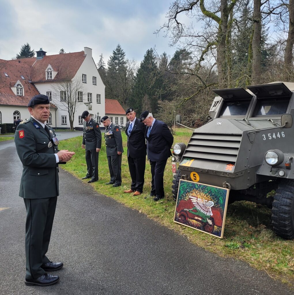 Een delegatie vanuit het regiment was aanwezig evenals het door hem geschilderde schilderij van de aanslag op Jan Vendrig en een GMC-15CWT pantserwagen uit het cavaleriemuseum.