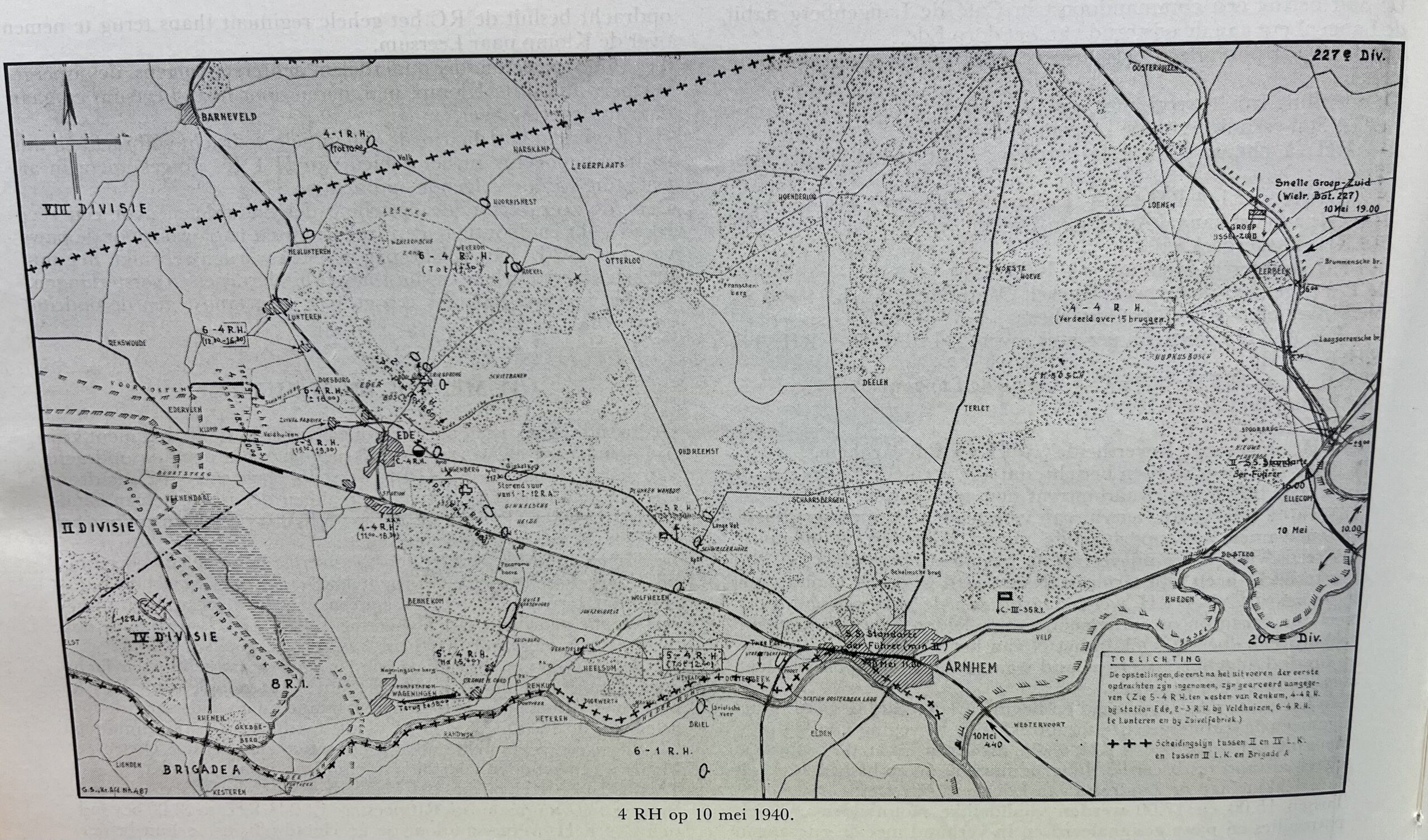 “4RH is pas teruggegaan nadat in overleg met den chaf staf van IV Div., welk overleg plaats vond op 13 mei te 14.00 op den kunstweg RHENEN-ELST, besloten werd dat 4RH de terugtocht van de overige troepen op UTRECHT zou dekken.”