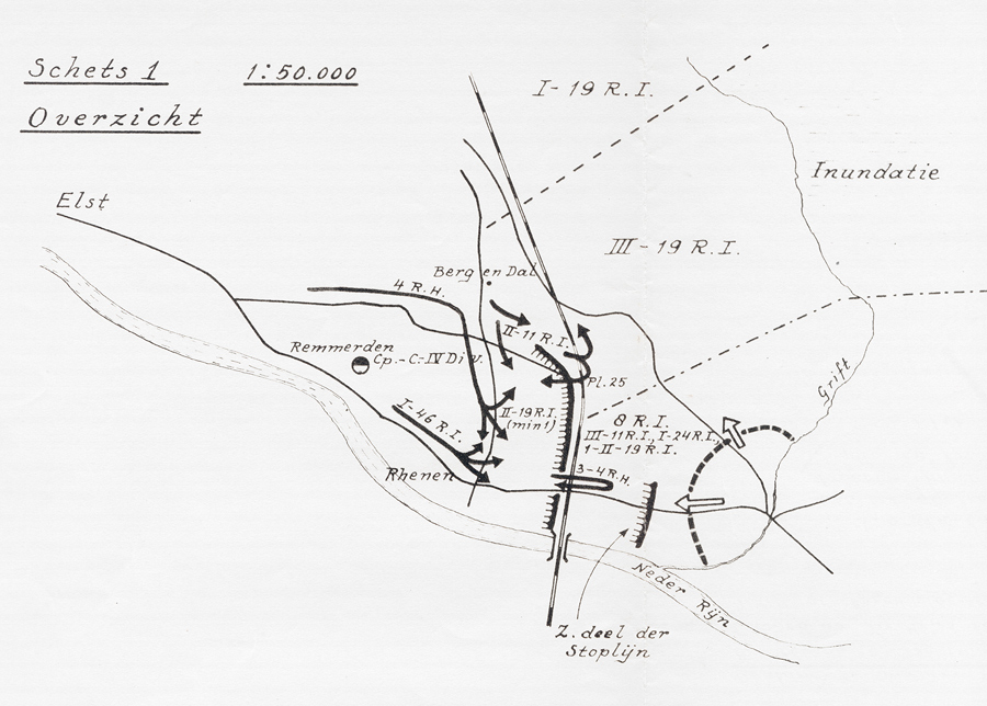 “(1) Het bevel werd door C.-4RH gegeven op grond van een kaartstudie. In het bevel nopens de overname van het commando over RHENEN ontbraken alle noodige gegevens omtrent vijand, eigen troepen en terrein, zoodat dienaangaande C.-4RH volkomen in het duister taste bij het geven van de bevelen, terwijl spoed vereischt werd. (2) Bij de bespreking op de commandopost van IV Div. was medegedeeld dat een strook ter breedte van 1 kilometer Oost van den spoorlijn vrij van vijand was, in ieder geval was het zaak een eventueele verdediging van den spoorlijn zoover mogelijk naar voren aan te vangen, zeker tot den rand van het oord RHENEN. (3) De ervaring door C.-4RH opgedaan op 10 mei d.a.v. dat “het gaan zitten en deze vijand af te wachten,” steeds eindigt met omtrekking. Vermeld zij dat de op 10 mei gevolgde beginselen zich grondde op van hoogerhand gegeven bevelen. (3) Voorts gaven psychologische overwegingen mede de doorslag, aangezien het aan C.-4RH op het tijdstip van geven van de bevelen bekend was, dat een groot deel van de voorste troepen hun opstellingen reeds hadden verlaten en bezig waren deze te verlaten. Vermenging en afwachten moest tot elken prijs worden vermeden door de mogelijkheid van een voorwaarts gaan.”