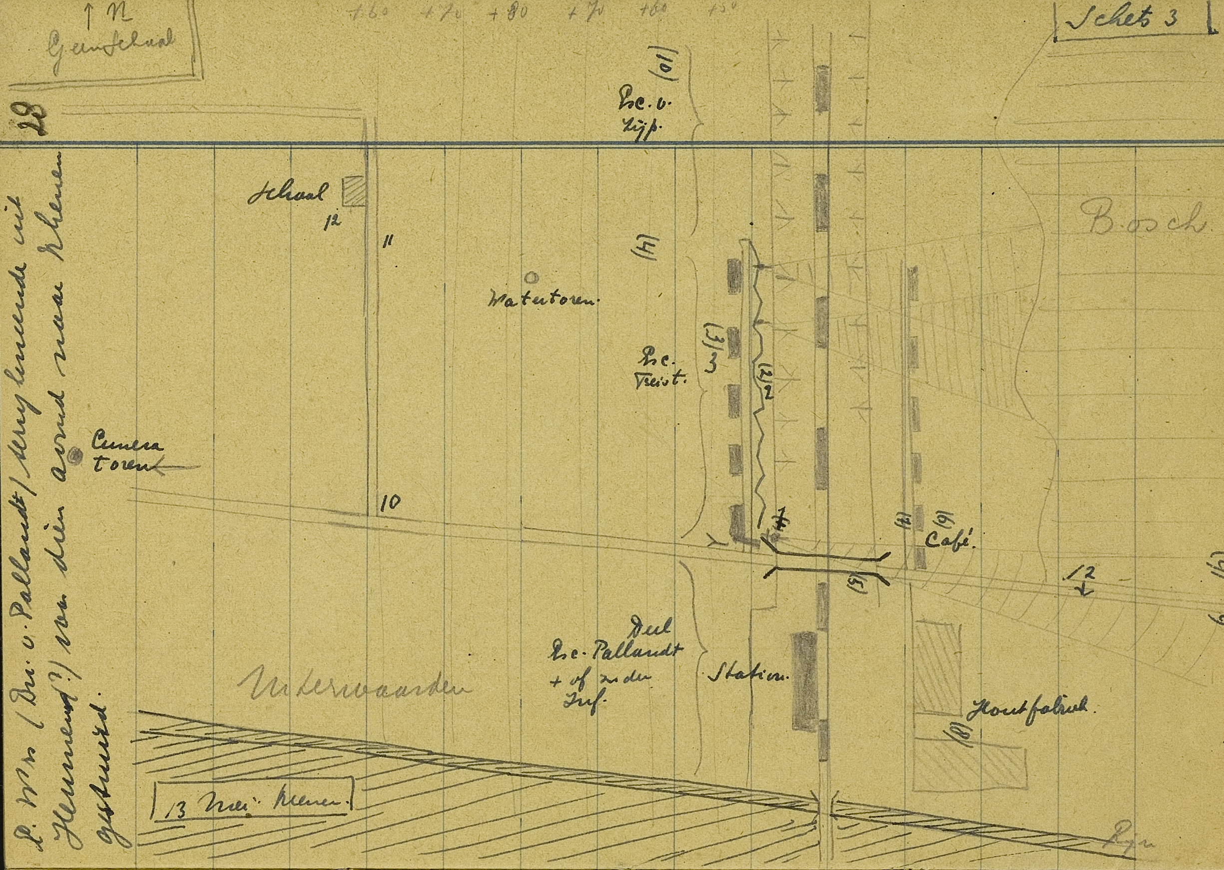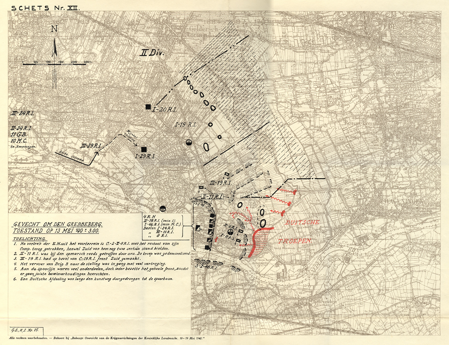 Tusschen zuidelijke en noordelijke peloton en wel waar op de stafkaart het woord ‘boom’ staat, stond de mij toegevoegde tweede sectie zware mitrailleurs, vuur uitbrengend op de kunstweg ARNHEM-WAGENINGEN nabij hoogte ‘DEN BRINK’, dus tot oostelijke van het spoorviaduct over genoemde kunstweg. In de onmiddellijke nabijheid dezer sectie zware mitrailleurs was de mij toegevoegde sectie mortieren opgesteld, vuur uitbrengend op de splitsing spoorwegen ARNHEM-UTRECHT en ARNHEM-NIJMEGEN en op de inzinking in den kunstweg Oost van station OOSTERBEEK-LAAK. Dit laatste als voornaamste staak. Tenslotte had ik een stuk pantserafweergeschut opgesteld bij Oostelijke ingang OOSTERBEEK…”