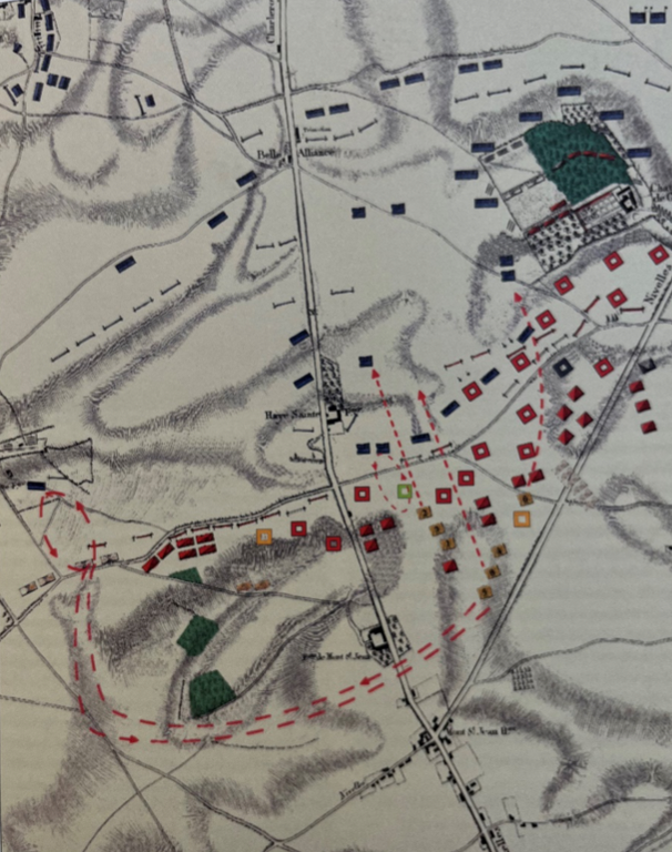 De Franse cavalerie aanval op de rechterflank in de vroege avond (16.00 – 19.00) met geallieerde infanterieblokken en cavalerie tegenaanvallen.