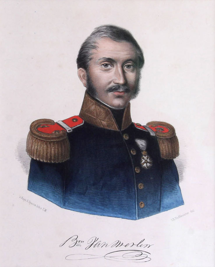 “Ik werd door de adjudant van Van Merlen weggehaald bij de gewonden om naar zijn gewonde generaal te kijken, die naar een nabijgelegen schuur was gebracht. Daar lag de dappere generaal op het stro, dodelijk gewond: een kanonskogel had een gedeelte van zijn buikwand weggenomen en zijn ingewanden verwoest. Verbinden had geen nut meer. Ik legde wat linnen over de man en de generaal zei tegen me (want hij was bij bewustzijn). “Meneer, u kunt niets meer voor me doen, maar ik lijd enorm. Dood me door me leeg te laten bloeden” Ik zei dat dat niet toegestaan was: “Maar wilt u wat drinken? U moet dorst hebben.”