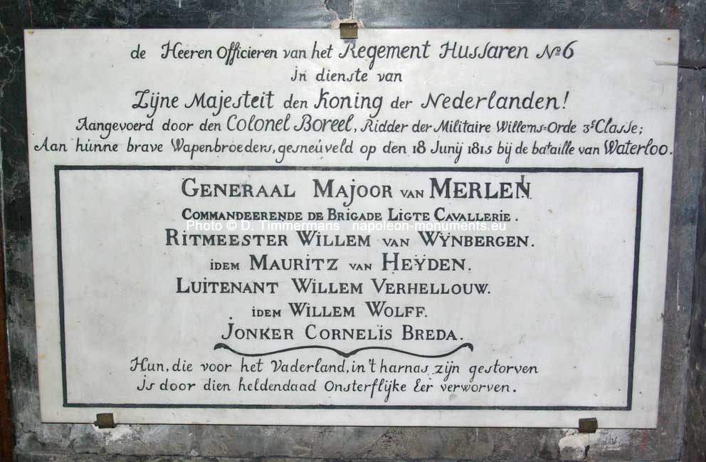 Tijdens die gevechten sneuvelde generaal-majoor Van Merlen echter. Na een charge met RH6 en RD5 op Franse tirailleurs iets oost van de boerderij La Haye Sainte stapte Van Merle van zijn paard en werd dodelijk getroffen door een kanonskogel. Zijn Aide-du-Camp, ritmeester Bellefroid sprong van zijn paard om hem te helpen en hielp hem van het slagveld, waarbij een huzaar van RH6 en een dragonder van RD5 hem droegen. Ze drogen hem naar Mont St.Jean waar de medische hulppost was. Hier probeerde de arts Rodi hem te redden:
