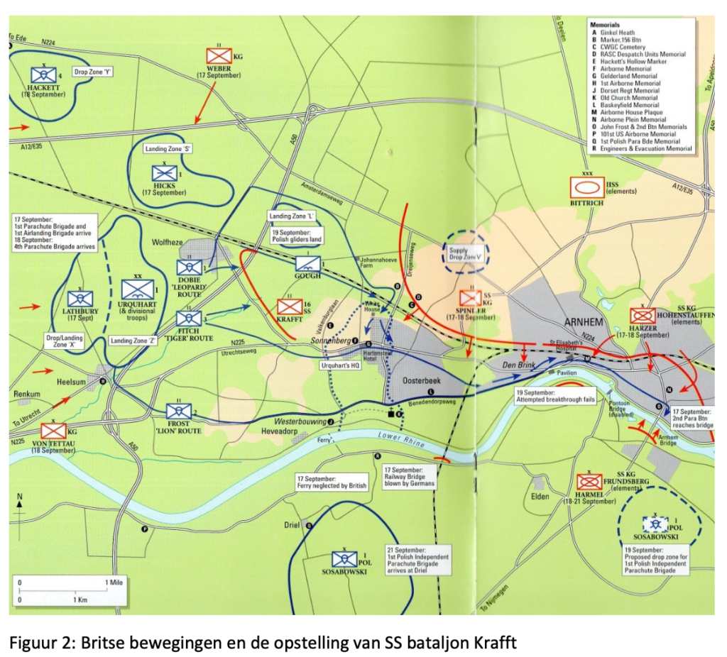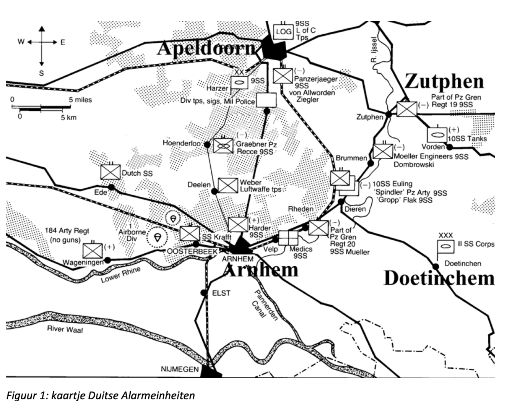 In de eerste weken van september waren er echter ervaren Duitse eenheden in het gebied aangekomen met aanzienlijke gevechtswaarde. Op 7 en 8 september arriveerde restanten van de 9e SS Panzerdivision Hohenstauffen onder bevel van SS luitenant-kolonel Harzer [3] en 10e SS Panzerdivision Frundsberg onder bevel van SS kolonel Harmel [4] in het gebied ten noorden en noordoosten van Arnhem [5]. Beide divisies hadden nog maar tussen de 20 en 30% van hun geautoriseerde sterkte en stonden onder bevel van het 2e SS Panzerkorps van SS generaal Bittrich. De 10e Frundsberg Division zou ter plekke worden gereorganiseerd en worden voorzien van nieuw materiaal. De 9e SS Panzerdivision Hohenstauffen moest haar resterend zware materiaal afgeven aan de 10e SS Panzerdivision Frundsberg en verder verplaatsen naar Siegen in Duitsland om daar nieuwe materiaal en verse manschappen te ontvangen. Diverse Hohenstauffen-officieren negeerden of ontweken echter het bevel om het zware materiaal af te geven aan hun zusterdivisie. Beide divisies beschikten over ieder nog zo’n 2500 man.