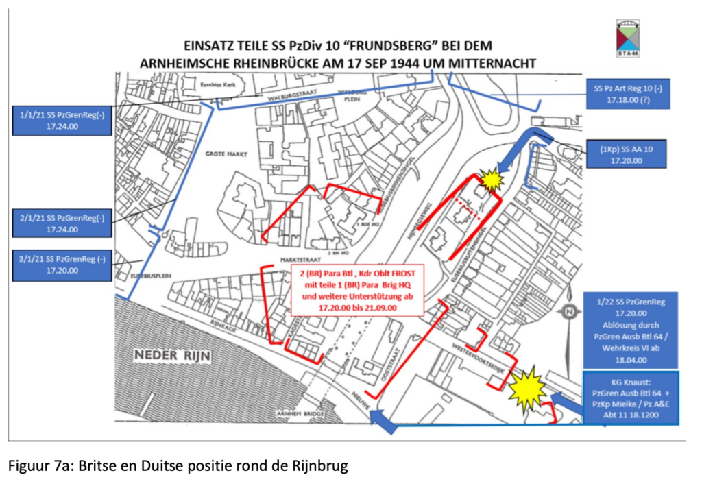 De Duitse bevelsverhoudingen werden nu wat verwarrend. Het verkenningsbataljon van Gräbner werd nu onder bevel gesteld van de 10e SS Panzerdivision Frundsberg die immers voor de situatie in Nijmegen verantwoordelijk was. Als compensatie kreeg de 9e SS Panzerdivision Hohenstauffen het verkenningsbataljon van de 10e SS Panzerdivision Frundsberg toegewezen. Deze eenheid (Kampfgruppe ‘Brinkmann’) had echter een veel geringere gevechtskracht. Kampfgruppe ‘Brinkmann’ rukte ook op richting de brug over de Rijn bij Arnhem en raakte rond de schemering om 20.00 uur in gevecht met het Britse 2e Parabataljon van Frost die intussen de noordelijke oprit van de brug had bezet. Net zoals andere, voor Nijmegen bestemde, Duitse eenheden, waaronder het bataljon Euling van de 10e SS Panzerdivision Frundsberg en de Kampfgruppe Trapp (3e cie van het 21e Panzer-Grenadier Regiment 10e SS Panzerdivision Frundsberg). De noordelijke oprit van de brug was nu echter in Britse handen en de eenheden van de 10e SS Panzerdivision Frundsberg moesten daarom een andere manier vinden om de Rijn over te steken en naar Nijmegen te verplaatsen.