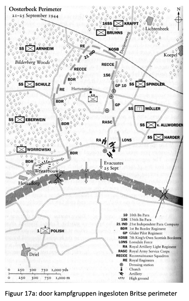 De eenheden van Harzer waren van noord naar zuid aan de oostzijde van de perimeter de Kampfgruppen ‘Bruhns’, en ‘ Spindler’. Deze laatste bestond uit de drie subgroepen ‘Müller’, ‘Spindler’, ‘von Allworden’ en ‘Harder’. Aan de westzijde van de perimeter vanaf de rivier naar het noorden waren de eenheden van Division ‘von Tettau’ gearrangeerd, met van zuid naar noord de bataljons van ‘Wossowski’, ‘Schulz’, ‘Eberwein’ [39] en ‘Krafft’ [40], waarna aansluiting was met de eenheden van Harzer. Alle andere eenheden werden verder naar achteren geplaatst en als reserve gereed gehouden ten westen bij Elden of ten oosten bij Velp. Vanuit de noordoever van de Rijn nam de Duitse artillerie ook Poolse opstellingen ten zuiden van de rivier onder vuur.