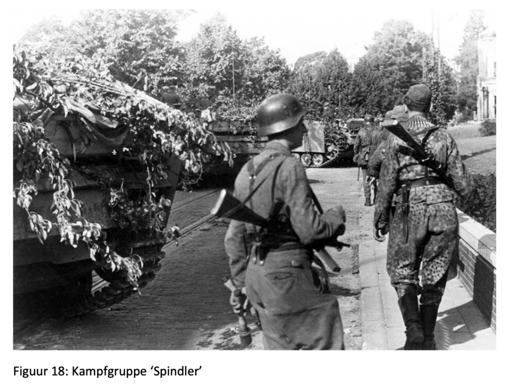 Intussen was de Kampfgruppe ‘Spindler’ weer versterkt. Ditmaal met stukken Sturmgeschutz III van de Wehrmacht Sturmgeschutz Brigade 280, die verdeeld werden over de diverse Kampfgruppen. De Duitsers hadden intussen ook de Britse para’s in het noorden ingesloten en hier hun Sperrlinie vervolmaakt. Hier vocht het SS bataljon van Krafft (parallel aan de Koningsweg) en Kampfgruppe ‘von Allworden’ (langs de spoorlijn) en ook hier liepen Britse aanvallen vast in moorddadig vuur van SS-ers en zwaar geschut van pantserwagens en stukken Sturmgeschutz.