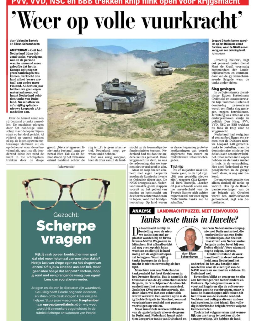 Op 5 september werd op onze eigen Bernhardkazerne in Amersfoort de Defensienota 2024 gepresenteerd. Tussen gebouw A (voormalige SBOC) en gebouw C (voertuigen Cavaleriemuseum) werd op spectaculaire wijze door Minister Brekelmans, staatssecretaris Tuinman en Commandant der Strijdkrachten generaal Onno Eichelsheim de plannen bekendgemaakt waar binnen Defensie al vele jaren naar uitgekeken is: de terugkeer van de Nederlandse tank binnen de Landmacht. Natuurlijk blijft er ook nog wat over voor de andere krijgsmachtdelen.