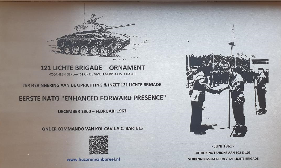 Minstens zoveel herinneringen riep het 121 Lichte Brigade-ornament op (de Chaffee tank) dat na lange jaren onherkenbaar was geworden. De inzet voor bijplaatsing van een Herinneringsplaquette mét QR code betekende het ophelderen van een stukje Cavalerie-inzet op het hoogtepunt van de Koude Oorlog jaren 1961 – ‘63.