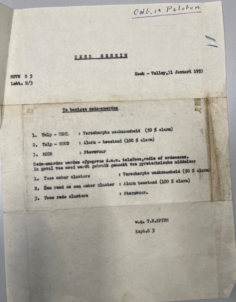 Ik lig op het afgesproken punt met mijn ordonnans/oppasser bij invallen duisternis te wachten op de Engelse patrouille om hen naar voren te brengen tot de beruchte doorgang en hen in positie te brengen. Toen na een half uur wachten niemand verscheen, vreesde ik dat de patrouille mogelijk was verdwaald. Ik zond mijn ordonnans/oppasser naar achteren om contact te zoeken. Aangezien de tijd drong en de vraag was wie eerst ter plekken zou zijn, wij of de Chinezen, was ik genoodzaakt om naar voren te gaan om daar, weliswaar met gemengde gevoelens, een éénmanspost te betrekken. Aangezien ik over enkele dagen naar Nederland zou terugkeren, lag ik toch alleen mijn laatste frontnacht onder de Koreaanse sterrenhemel te vieren. Na enige tijd kwam mij oppasser aankruipen en zei: “het zooitje ligt achter me, allemaal rotsmoezen, gewoon te laat.” De overgave verliep snel en ik heb getracht mijn misgenoegen te onderdrukken. Met opgewerkt gemoed ruimden wij bieden het veld om ons bij ochtendgloren bij het bataljon te voegen.