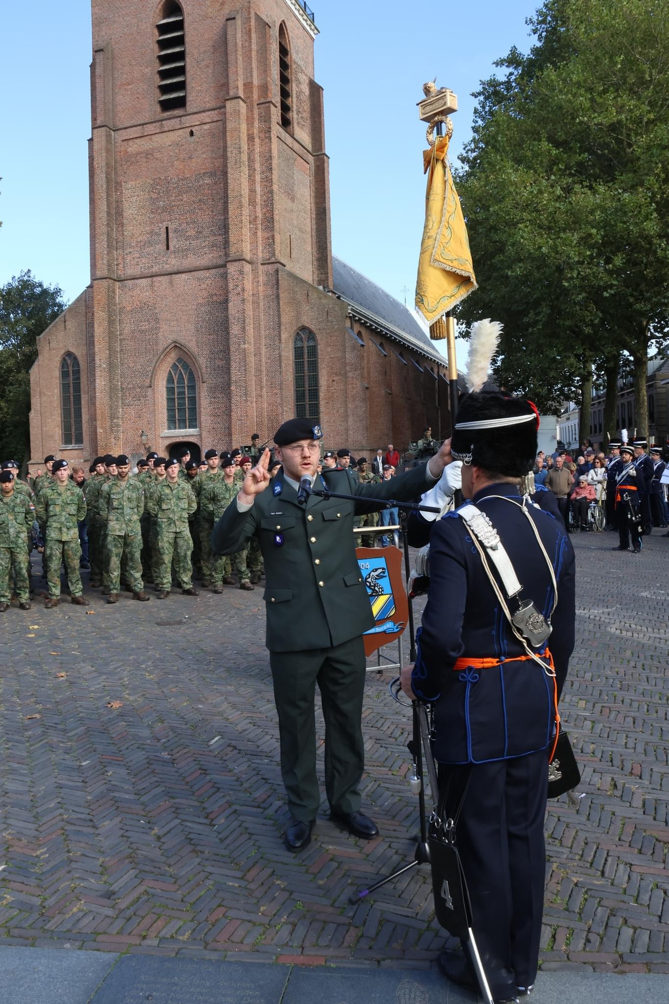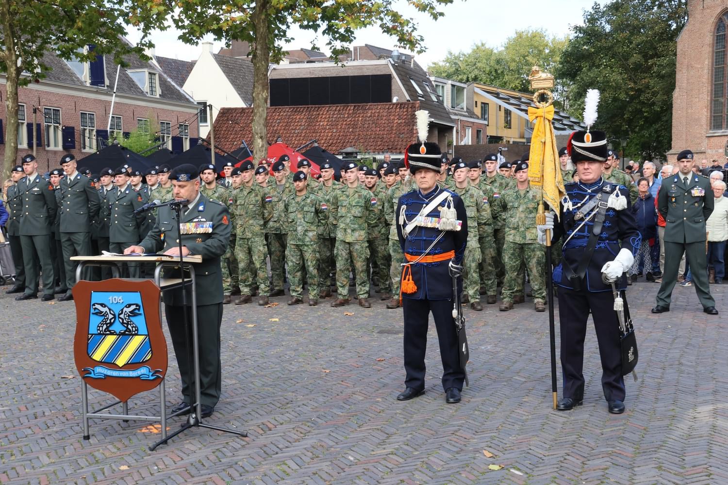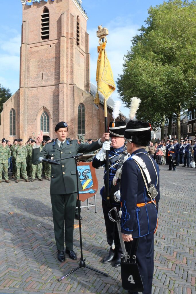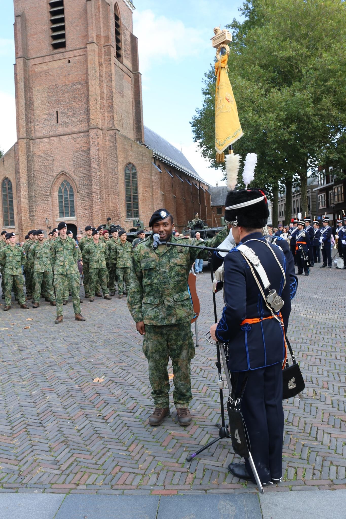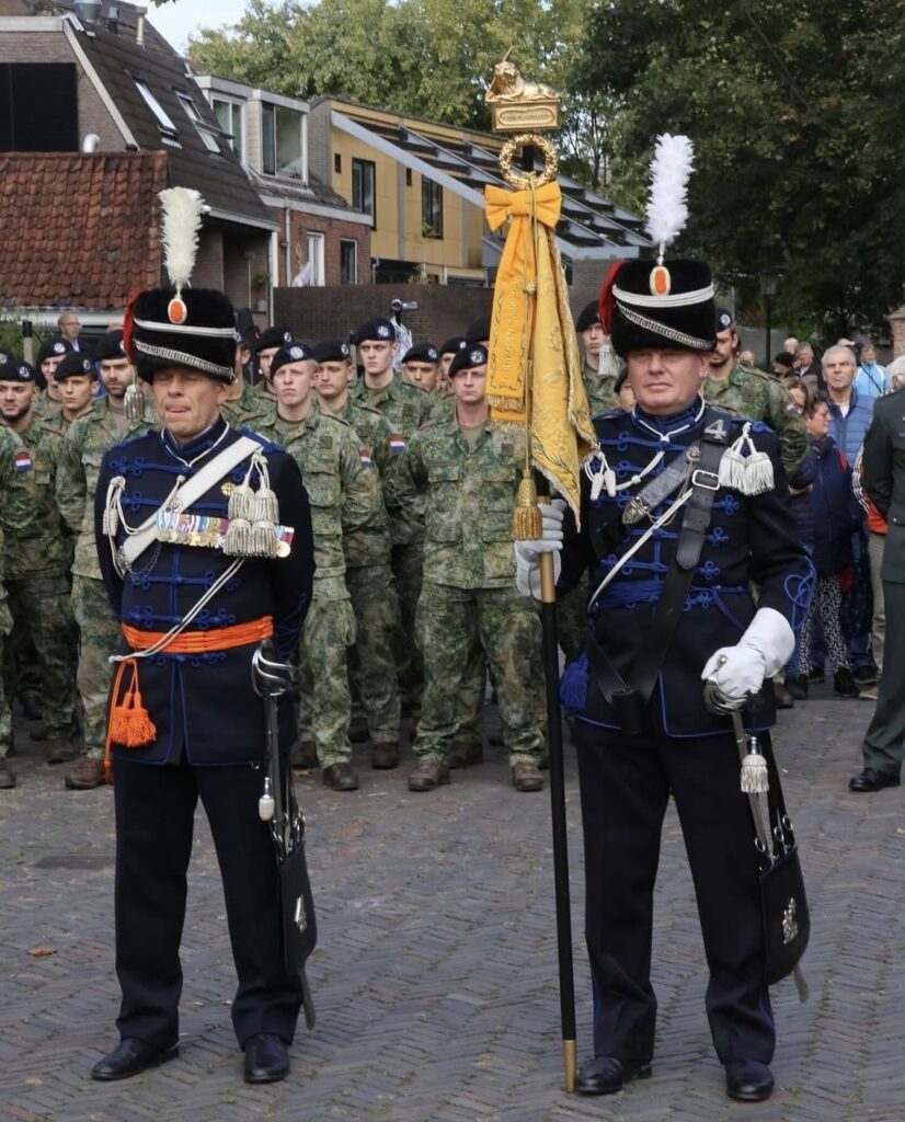 Daarom is het ook zo speciaal dat onze nieuwe jonge militairen hier op deze zo gedenkwaardige plaats midden in het Cordon van Holland en midden in de bevolking, de eed of belofte mogen afleggen op onze Regimentstandaard. Dezelfde Standaard die ook het al genoemde driemanschap noemde, toen ze opriepen “Nederlanders, wy roepen u op om den Standaard te scharen die wy geplant hebben, wy roepen u op om de wapens als mannen op te vatten en den vyand die nog steeds op onze bodem ons schynt te trotseren, doch reeds sidderd voor onze verééniging, van onze grenzen te verdryven..[..]”