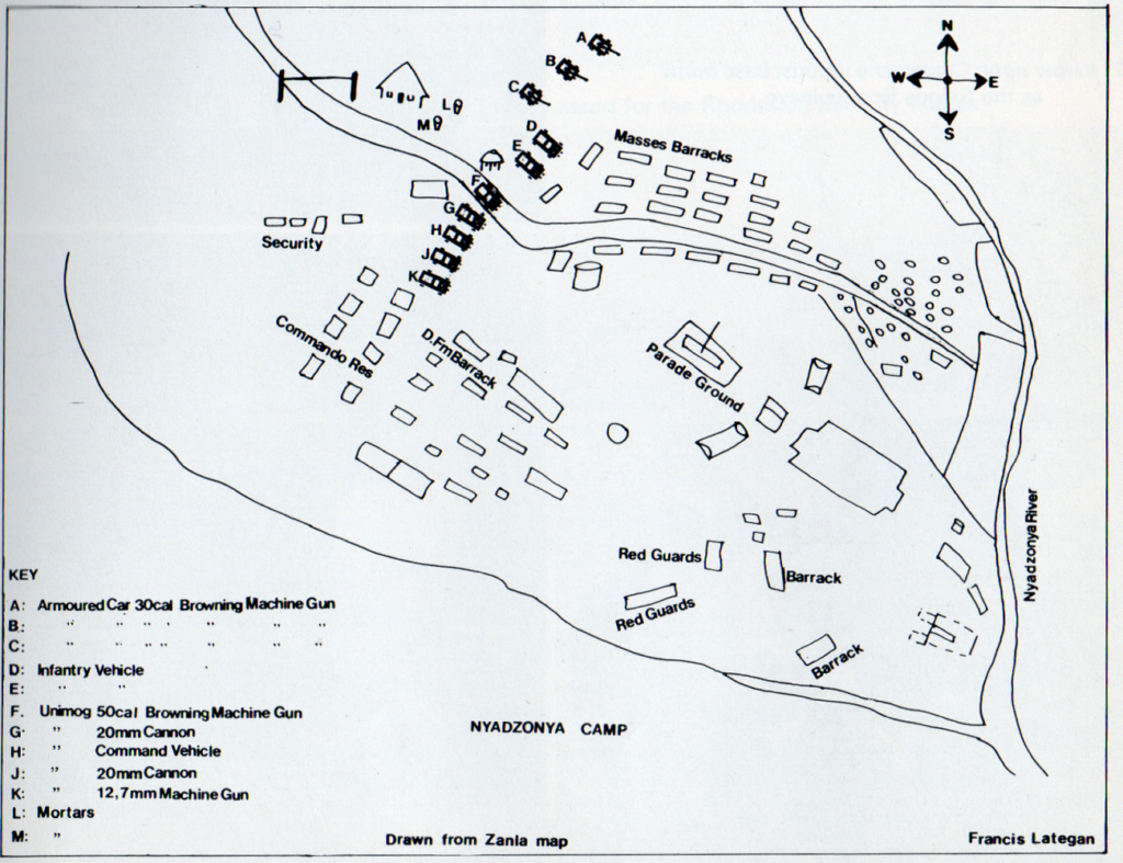 Net voor dagaanbreken werd de aanval ingezet. Op drie km afstand van het kamp nam een infanteriesectie samen met de geniesectie (in totaal dus drie Unimogs) gevechtsposities in om de rug van de aanvallende colonne te beveiligen . Hierdoor bleven er zeven Unimogs en drie Ferrets over voor de aanval op het kamp. Om 08.25 werd de ingang van het kamp bereikt en openden de ZANLA wachtposten de slagboom, nadat er in het Portugees bevelen vanuit de colonne waren geschreeuwd naar de wachtposten. Er waren twee aanvalsplannen. Plan A was een omsingeling van de aangetreden manschappen met de voertuigen en ze vervolgens autoritair toespreken met een Portugees sprekende Selous Scout als ware hij een hooggeplaatste FRELIMO officier en dit vertalen in Shona. Hierna zouden geselecteerde leiders van de ‘rebellen’ worden gearresteerd en weggevoerd. Daarna zou het vuur op de verzamelde rebellen worden geopend. Plan B voorzag in fysiek verzet door de rebellen en was gebaseerd op vooraf afgesproken vuurposities door de voertuigen.