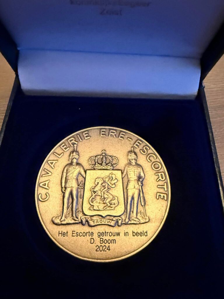Uit handen van de voorzitter van de Stichting Cavalerie Ere-escorte, Generaal-majoor Henk Morsink, ontving hij de CEE-legpenning in brons als waardering voor 20 jaar onafgebroken enthousiast fotograferen van ontelbare uitvoeringen en oefenmomenten van het Cavalerie Ere-escorte.