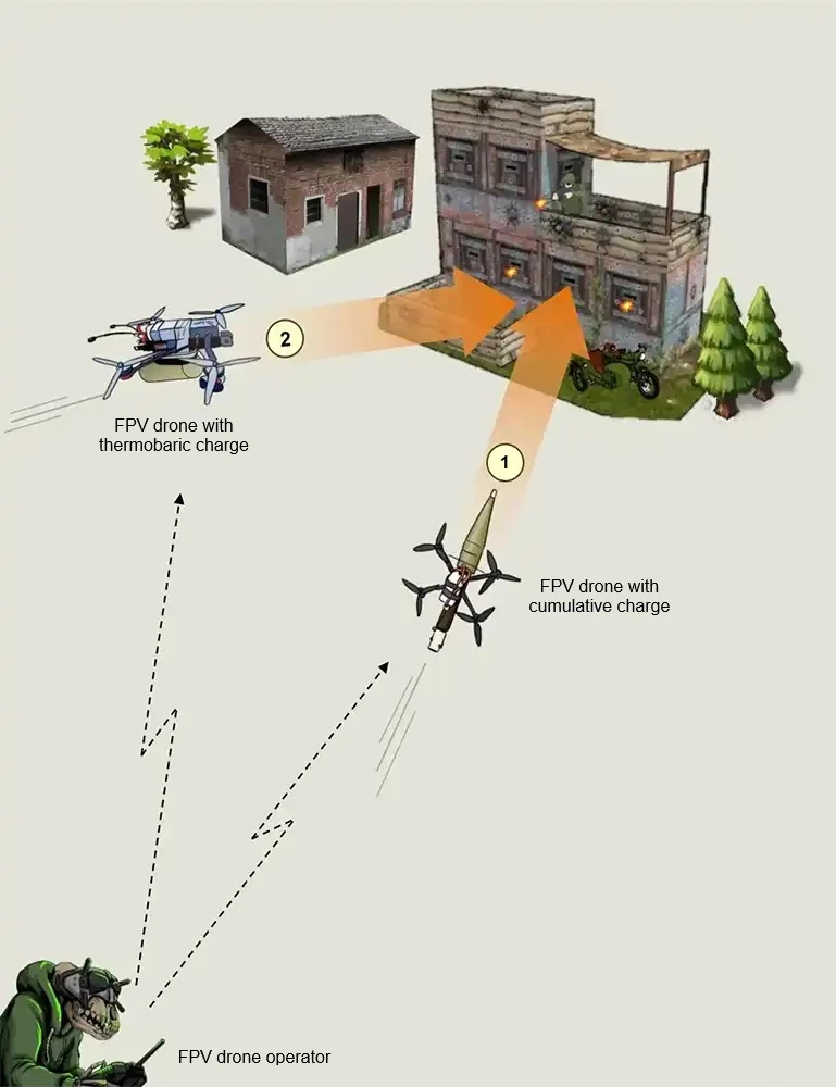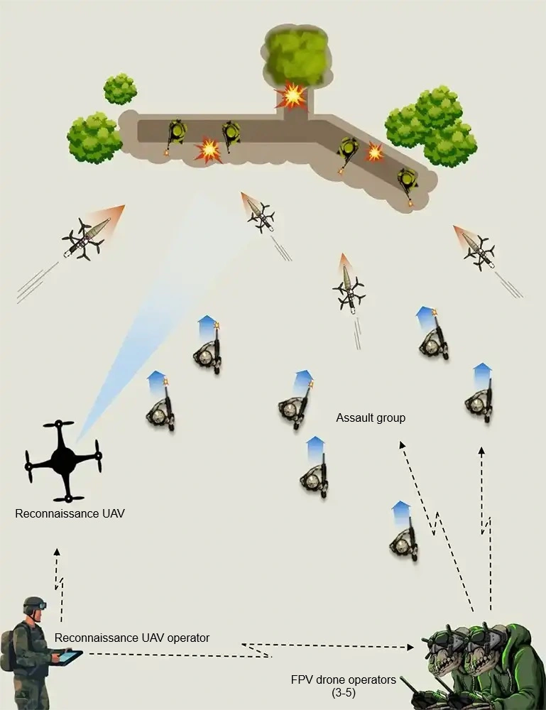 Onlangs verscheen een Russisch tactisch voorschrift waarin Oekraïense tactieken met drones werden behandeld en manieren om zich daar tegen te verdedigen. Kamikaze drones waren namelijk verantwoordelijk voor 70% van de Russische gevechtsverliezen in materiaal en personeel in de directe omgeving van het front. De effectiviteit van tactische drones was enorm. Ze waren in staat ladingen te verplaatsen meerdere malen groter dan hun eigen gewicht met snelheden van meer dan 120 km/u en met een reikwijdte tot ongeveer 10 km. Volgens de Russen nam het militaire gebruik snel toe, door de steeds groter wordende weerbaarheid van drones tegen EOV tegenmaatregelen (o.a. door de meervoudige modulariteit van de systemen of ‘draad geleidde’ drones), mogelijkheid tot gebruik onder verminderde weers- en zichtomstandigheden, vergrote ‘payload’ aan wapens of munitie, technische combinaties met inlichtingensensoren en Artificial Intelligence en (niet in het minst) de lage kosten. Nadelen waren de relatief korte vluchttijden en het belang van specialistische bedienaars. Op het laatste punt constateerden de Russen aan Oekraïense kant daarom steeds meer speciale UAV test centrums en specialistische drone operator opleidingen ontstaan. Volgens het Russische voorschrift was het duidelijk dat drones oorlogvoering hadden veranderd en waren speciale tegenmaatregelen en technieken belangrijk.
