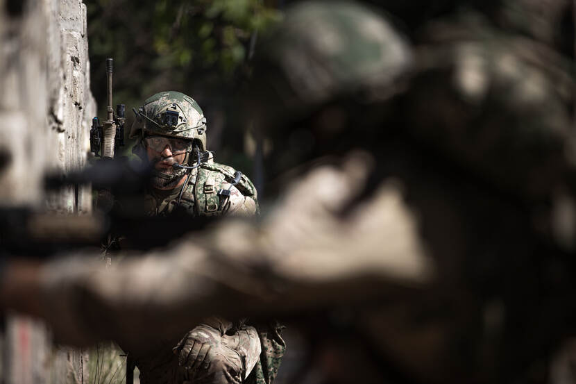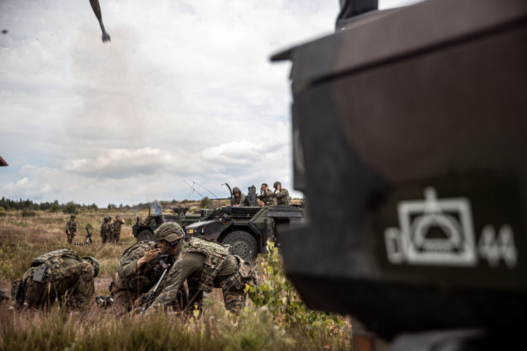 Tijdens de SOB van 43 BVE ging het vooral om de verkenningen met UAV’s en de aanvraag van vuursteun. Maar er was ook ruimte in het oefenprogramma voor uitgestegen actie. Het derde peloton is hier aan de beurt op Baan 22 van het oefenterrein.