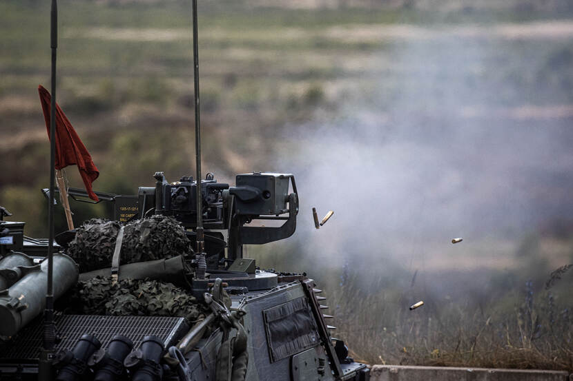 Als de steun van de artillerie nog niet mogelijk is, vertrouwt 43 BVE op de eigen wapens, zoals de .50. “Als we contact maken, zijn we vrijwel altijd in de minderheid”, zegt commandant 43 BVE, majoor Roland Borgman. “Maximaal vuren, rook gooien en wegwezen”, is dan het advies.