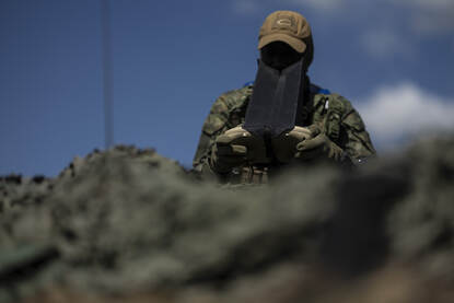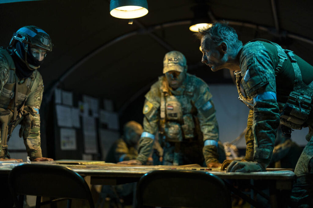 Terug naar de drone-operators. Turend door een zwarte koker om goed zicht te houden op het drone-besturingssysteem, spot Rutger het ene na het andere M113-infanterievoertuig van de vijand. Ernaast proberen uitgestegen militairen een brandje te blussen. “We houden de zuidelijke flank in de gaten en ontdekten net een 80 meter lange loopgraaf”, vertelt wachtmeester Eduard. “Waardevolle informatie voor onze mensen, die zelf een tegenaanval uitvoeren.”
