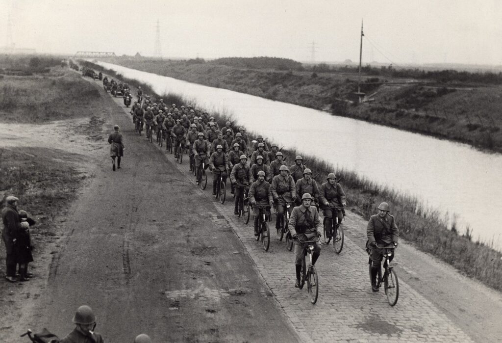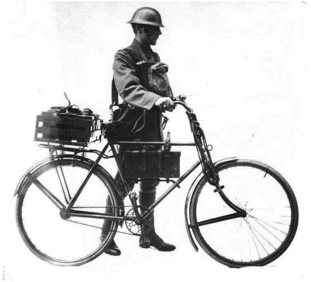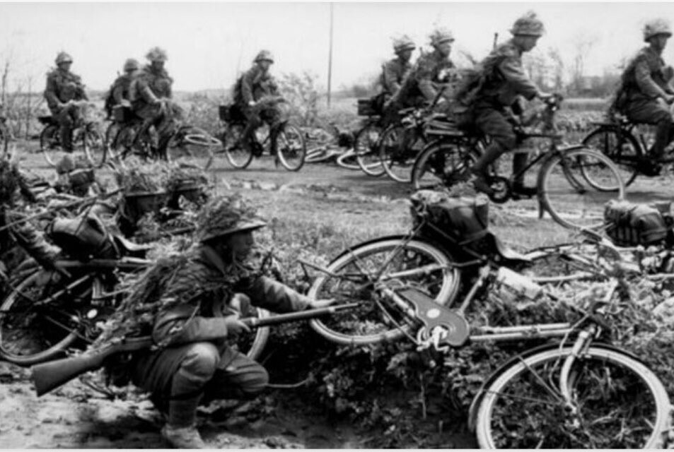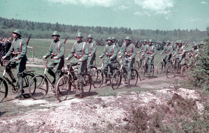 Ook het Duitse leger zag zich aan het einde van de oorlog genoodzaakt weer fietsen te gaan inzetten. De grote voertuigverliezen door geallieerde luchtaanvallen en algeheel gebrek aan brandstof noopte de ‘Wehrmacht’ tot deze alternatieve vorm van mobiliteit. Iets wat in de laaglanden van Vlaanderen, Nederland en Noord Duitsland bovendien relatief eenvoudig was door de grote hoeveelheid aanwezige civiele fietsen en goed ontwikkeld verhard wegennet.