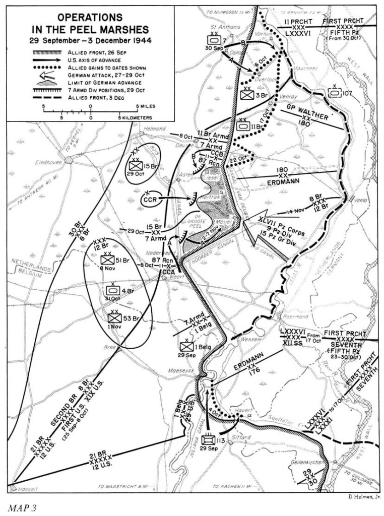 - Op aandringen van Montgomery had Eisenhower op 22 september 1944 besloten om de vakgrens tussen de 12 (US) Army Group en de 21 (BR) Army Group naar het noorden te verleggen. Dat betekende dat de Peel tot het Amerikaanse operatiegebied ging behoren. Met de verovering ervan werd het XIX (US) Corps belast, dat op de flank van de First (US) Army opereerde. Op 30 september 1944 ging de 7 (US) Armored Division bij Overloon tot de aanval over. Op 6 oktober 1944 liep de Amerikaanse aanval bij Overloon hopeloos vast. De Amerikanen werden door de 3 (BR) Infantry Division afgelost en kregen een beveiligende taak toegewezen langs het Kanaal van Deurne, de Noordervaart en het Kanaal van Wessem naar Nederweert; in dat verband werd het 87e Cavalry Reconnaissance Squadron belast met de beveiliging van het gebied rondom Meijel. ↩︎