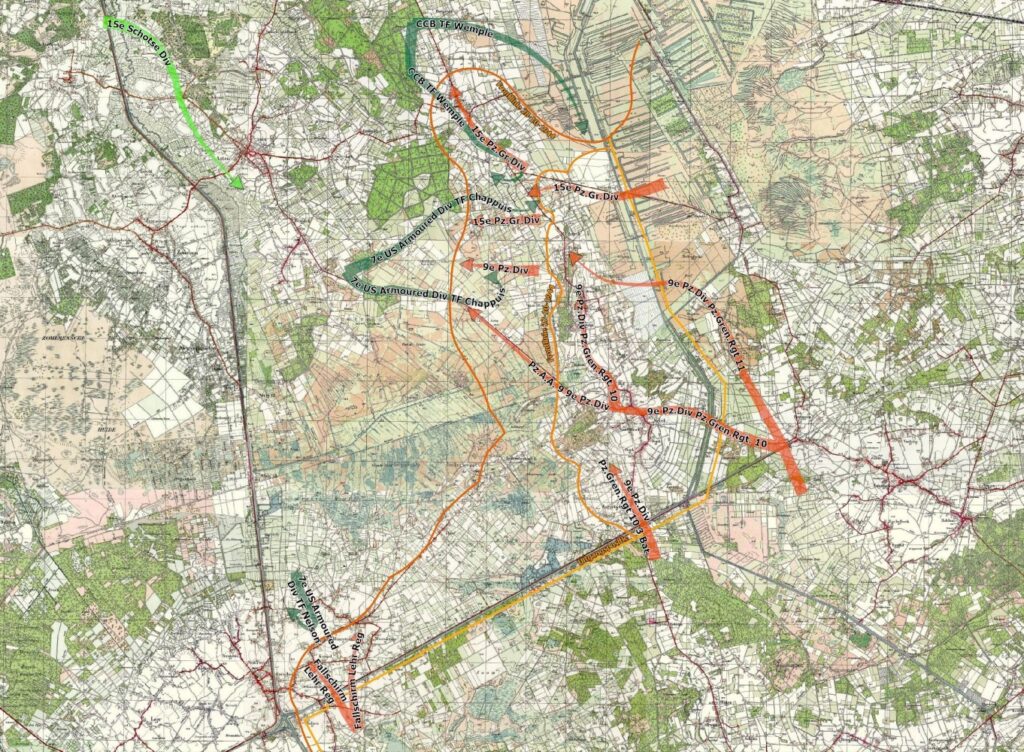 ‘Zu Beginn der letzten 8 Kriegsmonate wurden der 9e Pz.Div. im September 1944 zwei unerläβliche, sofortige Sperrmaβnahmen beim LXXXI. AK sowie die Durchführung von zwei schnelle Gegenslägen vor der Front des II. SS-PzKorps bzw. Beim XXXXVII. PzKorps übertragen. GFM Model durch Angriff mit begrenztem Ziel seine Offensiv gedachte Abwehr zu demonstrieren.’