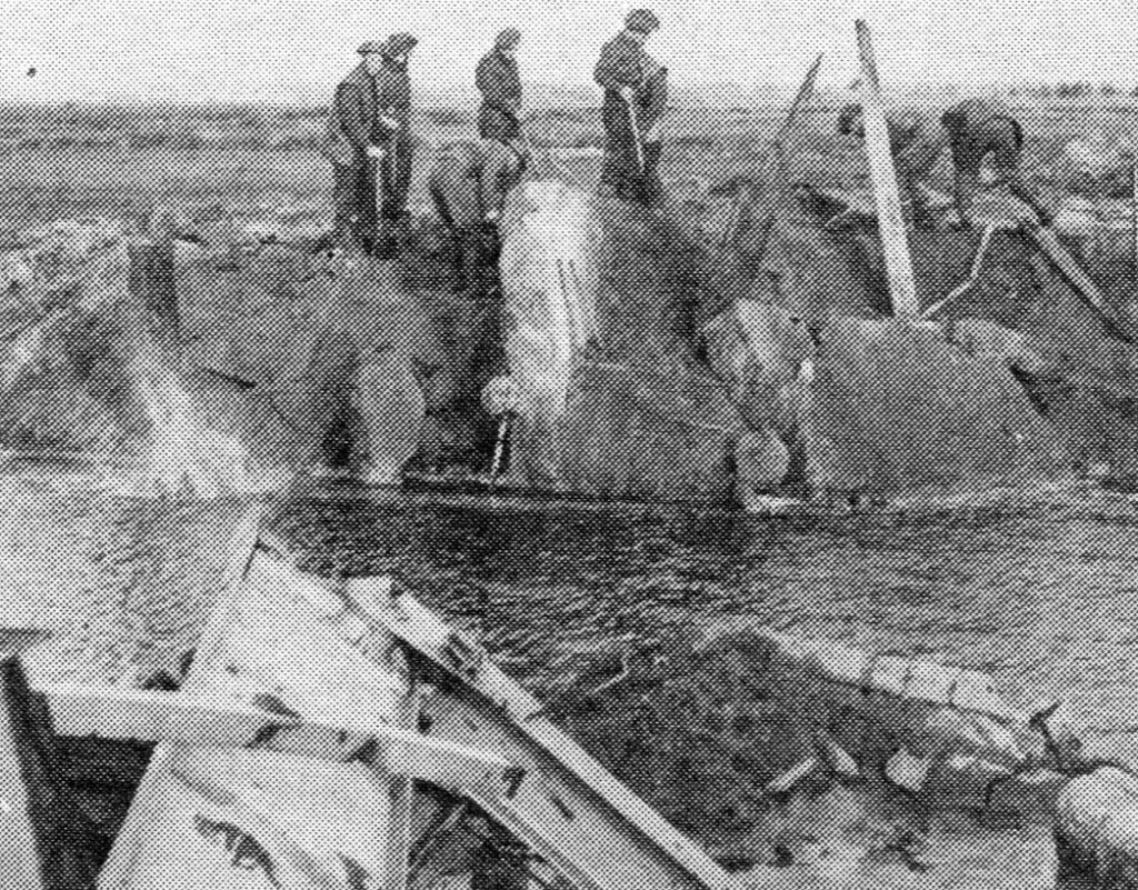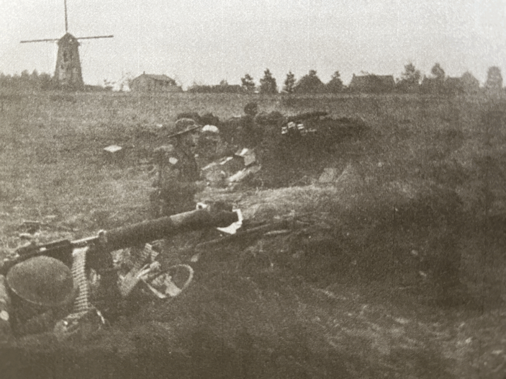 “Then, at 8 a.m. both battalions advanced eastward towards the canal under intense covering fire from artillery and machine-guns. When they had gone half a mile or so, the supporting tanks could go not farther through the bottomless mud. The infantry went on, meeting little opposition other than mortar-fire: the enemy had already gone across the canal and in such haste that they left a lot of their equipment behind. The Seaforth and Cameronians consolidated as best they could, facing east a little short of the canal. The ground was too boggy for digging.”