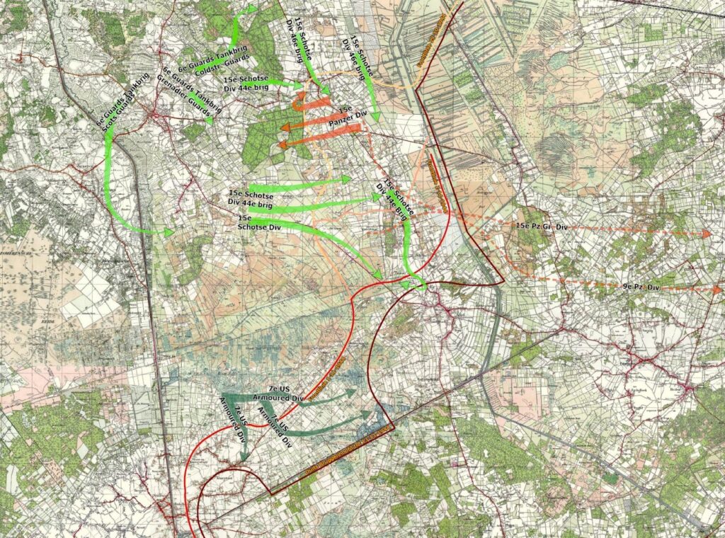 “About 9 a.m. the enemy began tapping all along the Glasgow Highlander front, while from Slot came sounds of tanks moving forward. An hour later the enemy put down on the Glasgow Highlanders’ forward company areas a series of artillery and mortar concentrations reminiscent of the fiercest fighting in Normandy. The German infantery then closed, accompanied by one or two tanks or S.P guns. Very close fighting along the whole battalion front followed. At the same time the enemy began to infiltrate round both flanks..[..]..By this time a medium machine gun platoon had of the Middlesex had arrived under the command of lieutenant Lloyd. He sited one of his sections to block the front edge of the wood, but the German tanks quickly knocked out both guns. After that the enemy poured unchecked into the wood to the southward. At the same time German tanks and infantry overrand one of the forward platoon localities.[..]..Brigadier Cockburn had promised Major Campbell Davies a squadron of the Tank Grenadier Guards ans also a company of the Royal Scots, to which he added a second company. Meanwhile however, the enemy had spread all through the wood, where they had immobilised all four rifle companies of the Glasgow Highlanders…[..]..It was the arrival of the squadron of the Tank Grenadiers soon after midday the restored the situation. With the tanks moving along the broad rides in support, the Glasgow Highlanders very soon cleared the wood betweeen their company areas and pushed the Germans back toward Slot. On the heels of the Tank Grenadiers came the two reinforcing companies of the Royal Scots, whom Major Campbell Davies put in on the right to extend the Glasgow Highlanders’ front southward..[..]..So the grim fighting ended. The Glasgow Highlanders and their supporting arms had suffered over eighty casualties.”