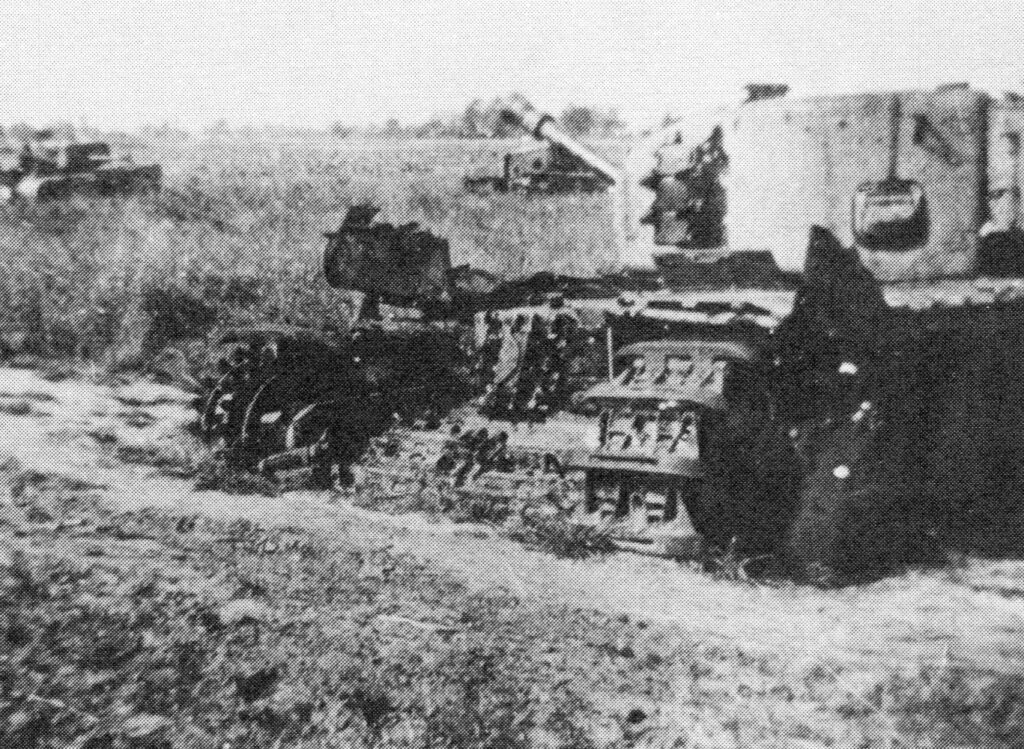 One after another tanks blew up whichever way they turned; tracks were merely churned the mud, so manoeuvre was impossible. All the while the enemy were putting down upon the bog everything they had got. If any tanks were to survive at all, the only course was to get the squadron out, so it was ordered to rally on the start-line eight hundred yards back. But only four tanks emerged from the bog, of which two were battle-worthy. The rest were stuck fast or disabled. For ten and a half hours thay day the artillery kept up their smoke-screen along six hundred yard of the canal bank. Under the cover of this screen the Grenadiers withdrew the crews and vital parts of the derelict tanks, together with their wounded and their codes.”
