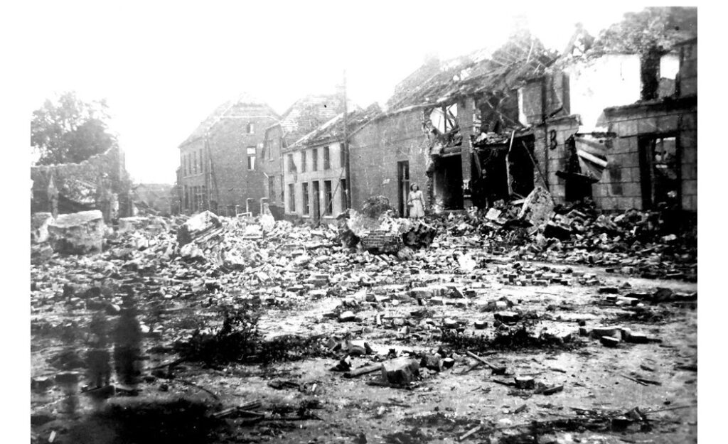 “It was a sad village. No house was undamaged. It was a muddy grubby little hole full of slates, broken glass and tattered curtains. A badly chipped church at the crossroads. The outlying farms lay in the countryside flat and waterlogged. A thin drizzle fell over everything and the mud on the raod was ankle deep.”