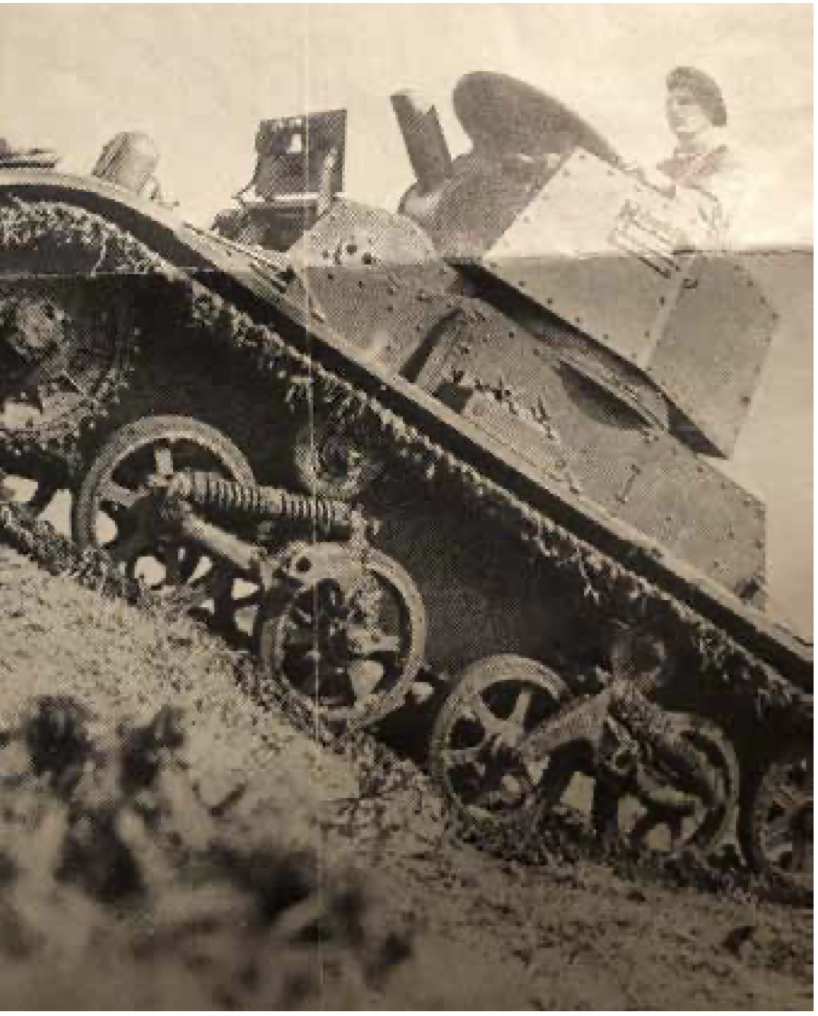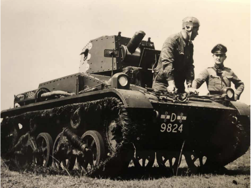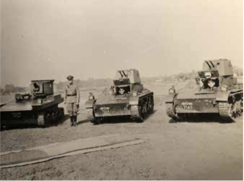 Figuur: Kap van Veen met de twee modellen Vicker Carden tanks. De drie bestuurders zijn de luitenants Wulfhorst, Brendgen en Bakhuys, de latere commandanten van de Mobiele Eenheid. (bron cavaleriemuseum)