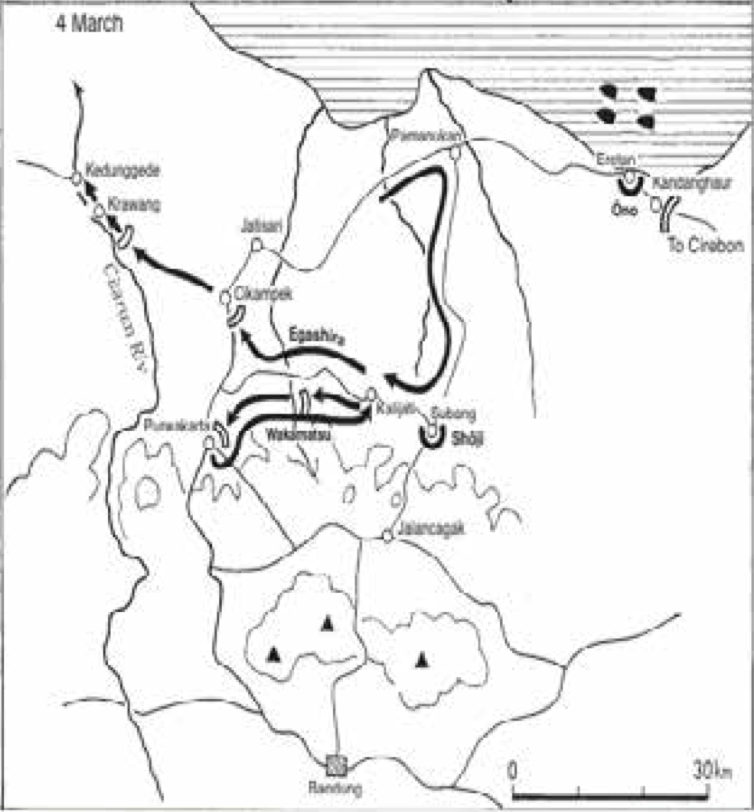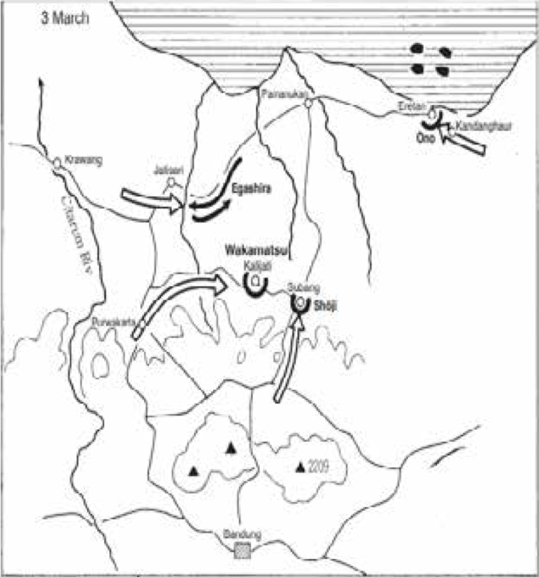 Om 11.00 ’s morgens werd de verdediging[20] van vliegveld Kalijati[21] verrast en viel het vliegveld met 50 lesvliegtuigen, 26 bommenwerpers en grote voorraden in handen van de Japanners. Al in de namiddag van 2 maart begonnen Japanse jagers en jachtbommenwerpers te arriveren op het vliegveld. Het detachement van majoor Masaru had inmiddels ook de belangrijke brug bij Pamenoekan veroverd, hierbij tijdens de naderingsmars wel gehinderd door Britse luchtaanvallen. De brug over de Tjitaroem rivier hadden ze door KNIL tegenstand niet kunnen bereiken. Deze werd pas op 4 maart via een omweg over Soebang veroverd.