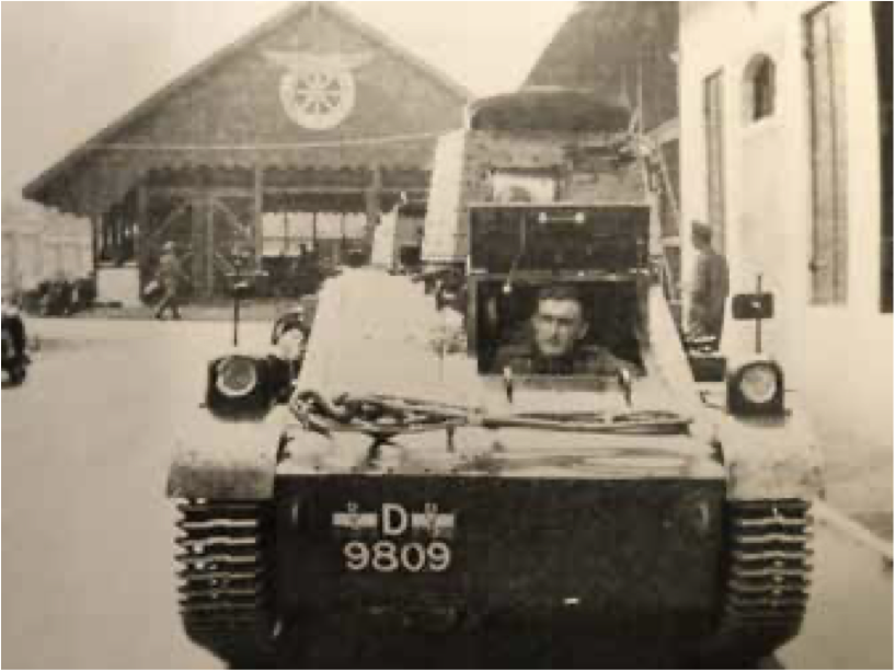 Figuur: lnt Heshusius achter de stuurknuppel van een Vickers Carden. Op de schuur achter het embleem van de Proefafdeling Vechtwagens (bron cavaleriemuseum)