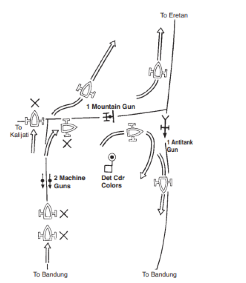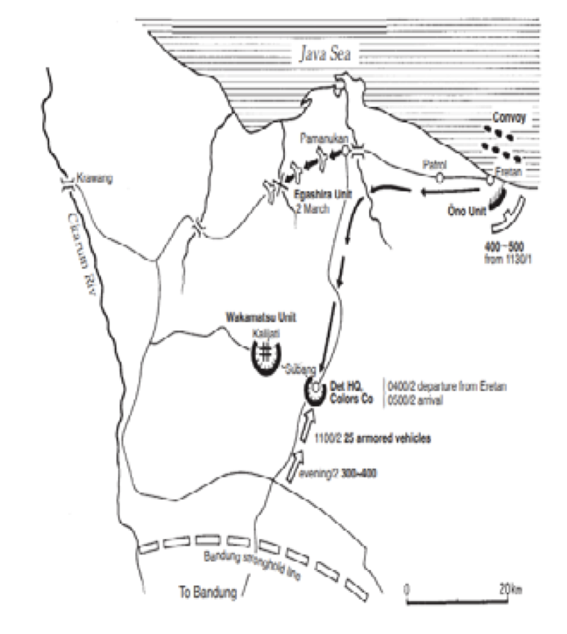 De KNIL had op Java drie divisies, verdeeld over het eiland en elk bestaande uit slechts drie tot vier bataljons met ondersteunende eenheden. De legerleiding van KNIL had het belang van West Java onderkend en hier de hoofdmacht gelegerd, een troepenmacht van 17.700 man, genaamd Groep West, o.l.v. genmaj Schilling. Bandoeng werd verdedigd door 5.900 man o.l.v. genmaj Pesman. Deze eenheid werd Groep Bandoeng genoemd. Hoewel intussen uit ervaringen van eerdere Japanse invasies het belang van vliegvelden duidelijk zou moeten zijn, werd het vliegveld van Kalijati pas op 28 februari in staat van verdediging gebracht. Te laat, want op 1 maart om middernacht landde de gevechtsgroep van kolonel Shoji bij Eretan Wetan. Deze landingsplaats was gekozen omdat hier de weg dicht langs de kust liep, zodat snel Japanse gemotoriseerde elementen op weg konden naar het 77 km verder weg gelegen vliegveld Kalijati. [16] De landing op deze plek kwam als verrassing en er waren dan ook geen KNIL troepen in de buurt. Nederlandse luchtaanvallen (12 Hurricanes) konden de landing weliswaar niet voorkomen, maar brachten wel gevoelige verliezen toe[17]. Kolonel Shoji lanceerde onmiddellijk twee gemotoriseerde aanvalsgroepen, elk bestaande uit een met tanks en geschut versterkt infanteriebataljon. Eén aanvalsgroep (2e bataljon o.l.v. majoor Wakamatsu Minoru) moest het vliegveld veroveren en de andere (1e bataljon o.lv. majoor Egashira Masaru)[18] werd op de strategisch gelegen brug over de Tjitaroem afgestuurd, waardoor de wegverbinding tussen Bandoeng en Batavia kon worden geblokkeerd. [19]