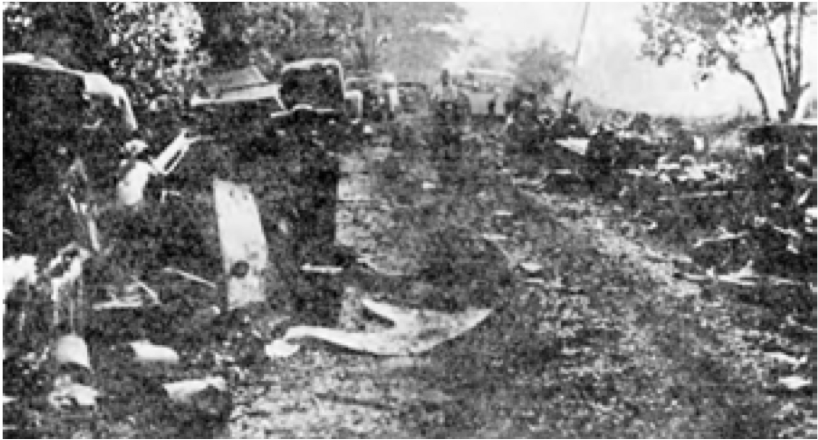 Figuur: Japanse foto van de gevolgen van de luchtaanval. De weg van Purwakarta naar Kalijati ligt bezaaid met wrakken.