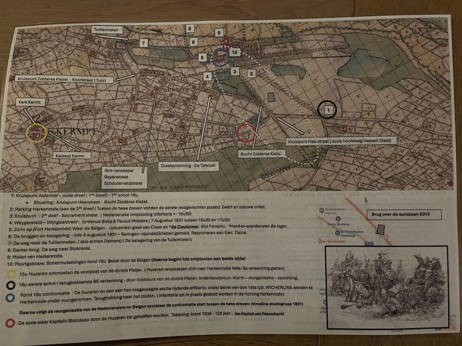 Ons Regiment Huzaren van Boreel, destijds 6RH, ging in augustus 1831 tijdens de Tiendaagse Veldtocht verkennend voorop en stuitte tussen Kermt (toen met een ‘p’ geschreven) en Kuringen op een voorhoede van het Belgische Maasleger. Na aanvankelijk een paar 100 meter terug gedreven te zijn, wisten we toch uiteindelijk de Belgen terug te drijven en viel het nabij gelegen Hasselt in Nederlandse handen.