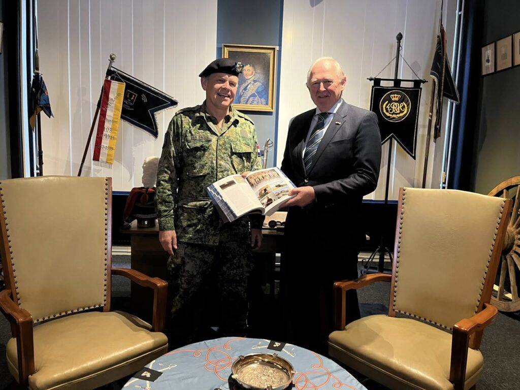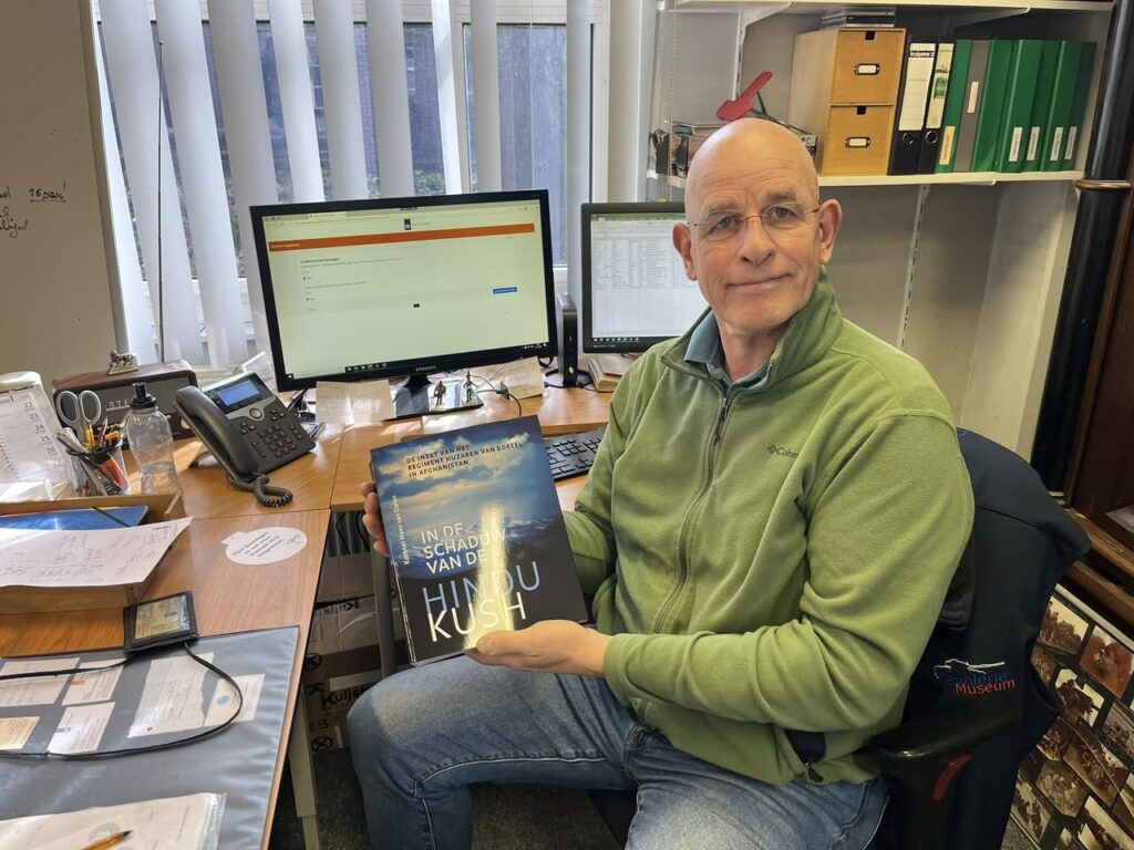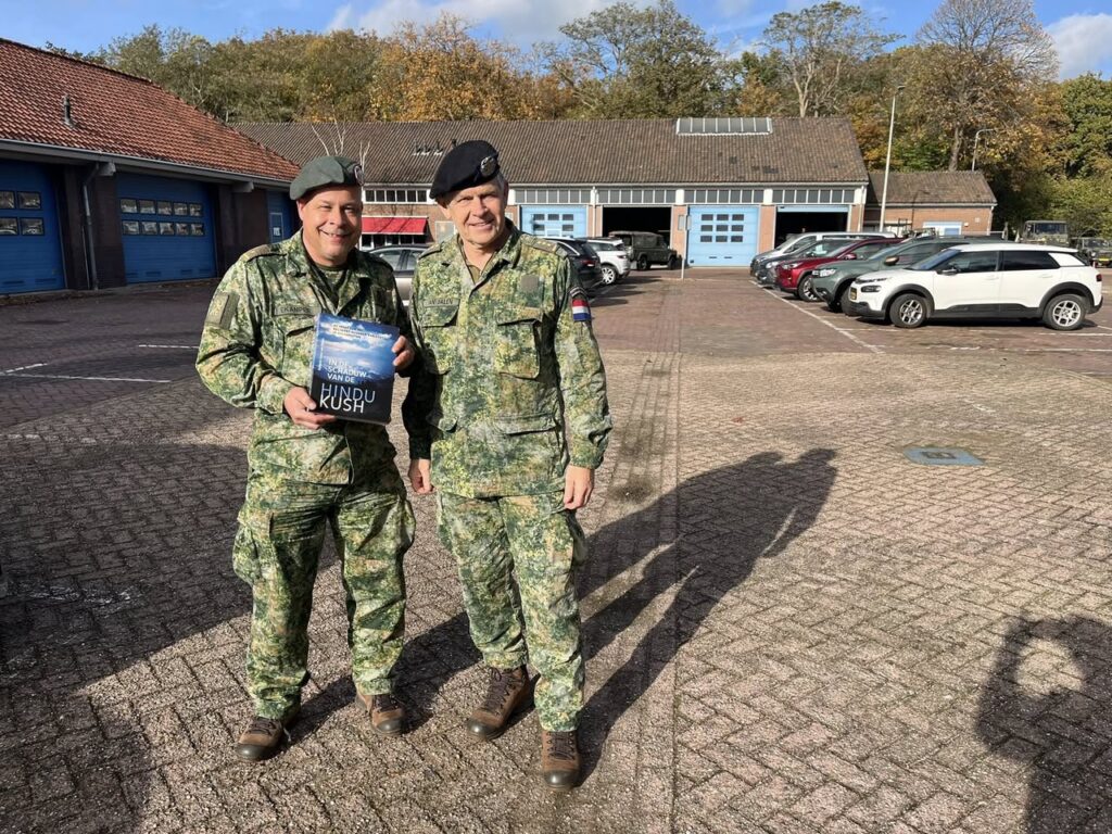 Sommigen weten hoe het ‘heurt.’ In pak compleet met Boreel-stropdas naar de Regimentskamer om het boek ‘In de Schaduw van de Hindu Kush’ in ontvangst te nemen. Complimenten voor lkol bd. Erwin Vonk. Hij wijst gelijk maar even de bladzijden aan waar hij schittert.