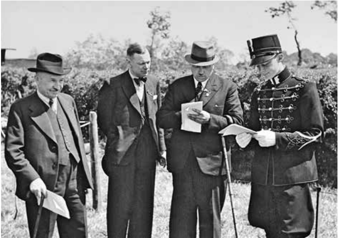 Dr. Reint baron de Vos van Steenwijk (links) in het weiland bij familielandgoed Voorwijk. Midden twee lokale functionarissen. Familiefoto.