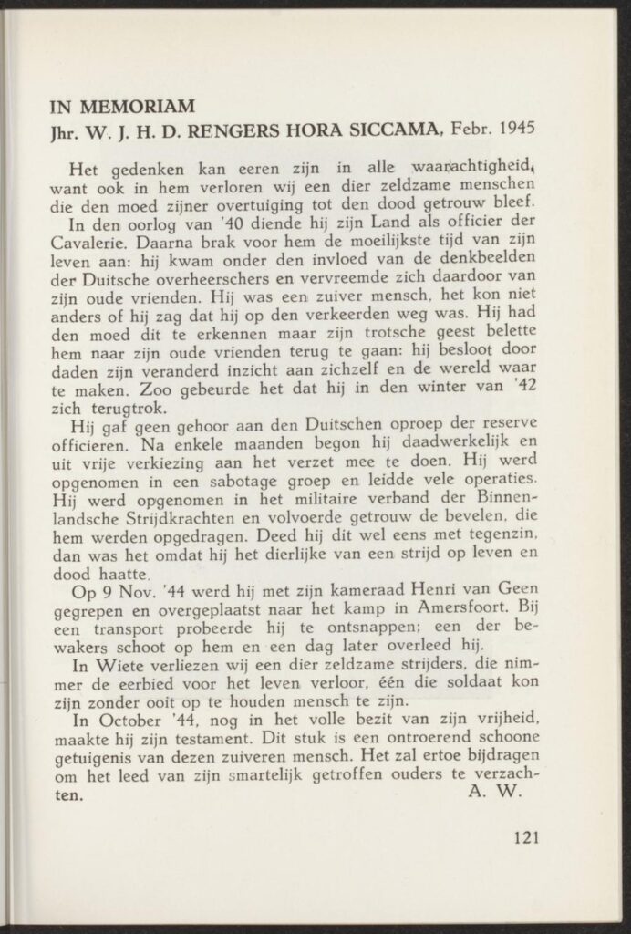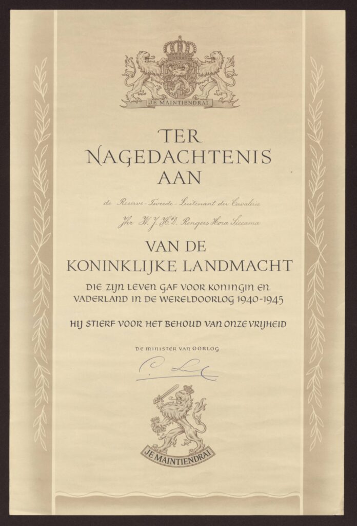 In dit artikel dat met medewerking van Bert-Jan Dierink tot stand is gekomen zetten we de schijnwerper op de klasgenoot op de School Reserve Officieren Cavalerie en kameraad Jonkheer mr. Wiardus Jacob Hendrik Duco Rengers Hora Siccama. Het VOC Mededelingen heeft hier al eerder en vaker aandacht aan besteed. Ook andere media zoals De Stentor gaven aandacht aan de door Bert-Jan verzamelde uniformen en geschiedenis, want zonder het achterliggende verhaal is zo’n atilla jasje natuurlijk ook “maar een atilla jasje”. Wiardus werd ook genoemd in het document van de VOC waarin alle omgekomen cavaleristen genoemd werden. Op pagina 24 vinden we George Maduro en op pagina 33 staat Wiardus Rengers Hora Siccama hierin genoemd.