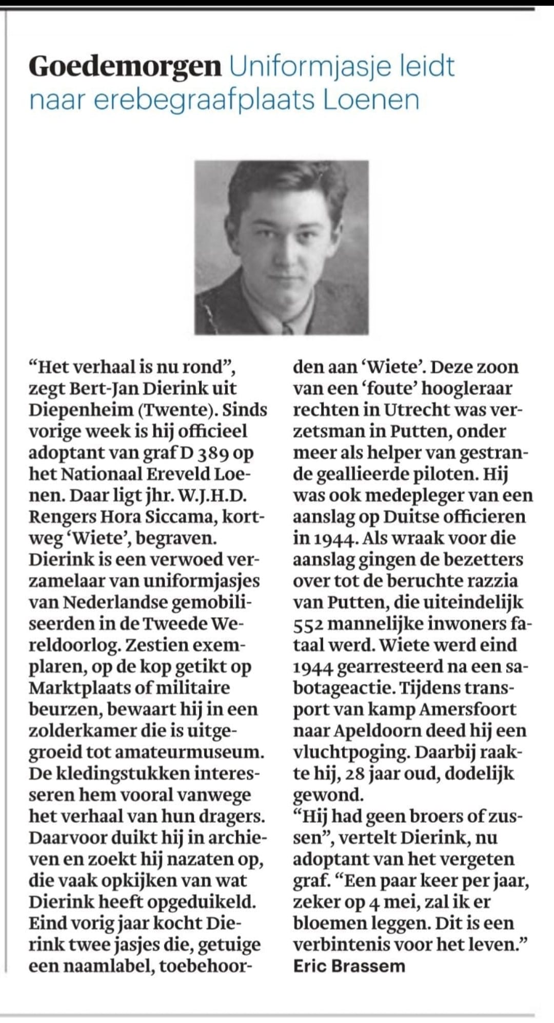 Door het doorslaan van verzetsstrijder Luther Kortlang uit Ermelo begrijpt de SD dat er piloten ondergedoken hebben gezeten op Huize Bijstein en dat de beide mannen meer op hun kerfstok hebben dan aanvankelijk gedacht. De jongens proberen onderweg naar de kazerne uit de auto te ontsnappen. Er ontstaat een gevecht met de SD’ers die hen bewaken, waarbij Wiardus zwaar gewond raakt en overleed na aankomst in het ziekenhuis van Apeldoorn. Hij werd aanvankelijk begraven op 6 februari te Ugchelen, maar later in 1976 herbegraven in Loenen (Gld.) Vak D grafnummer 389. Bert-Jan heeft twee uniformjassen die toebehoorden aan Wiardus en heeft het graf geadopteerd waar hij enkele keren per jaar bloemen legt. Bert-Jan heeft naast zijn kleine museum ook geregeld de pen vast om zijn kennis te delen.