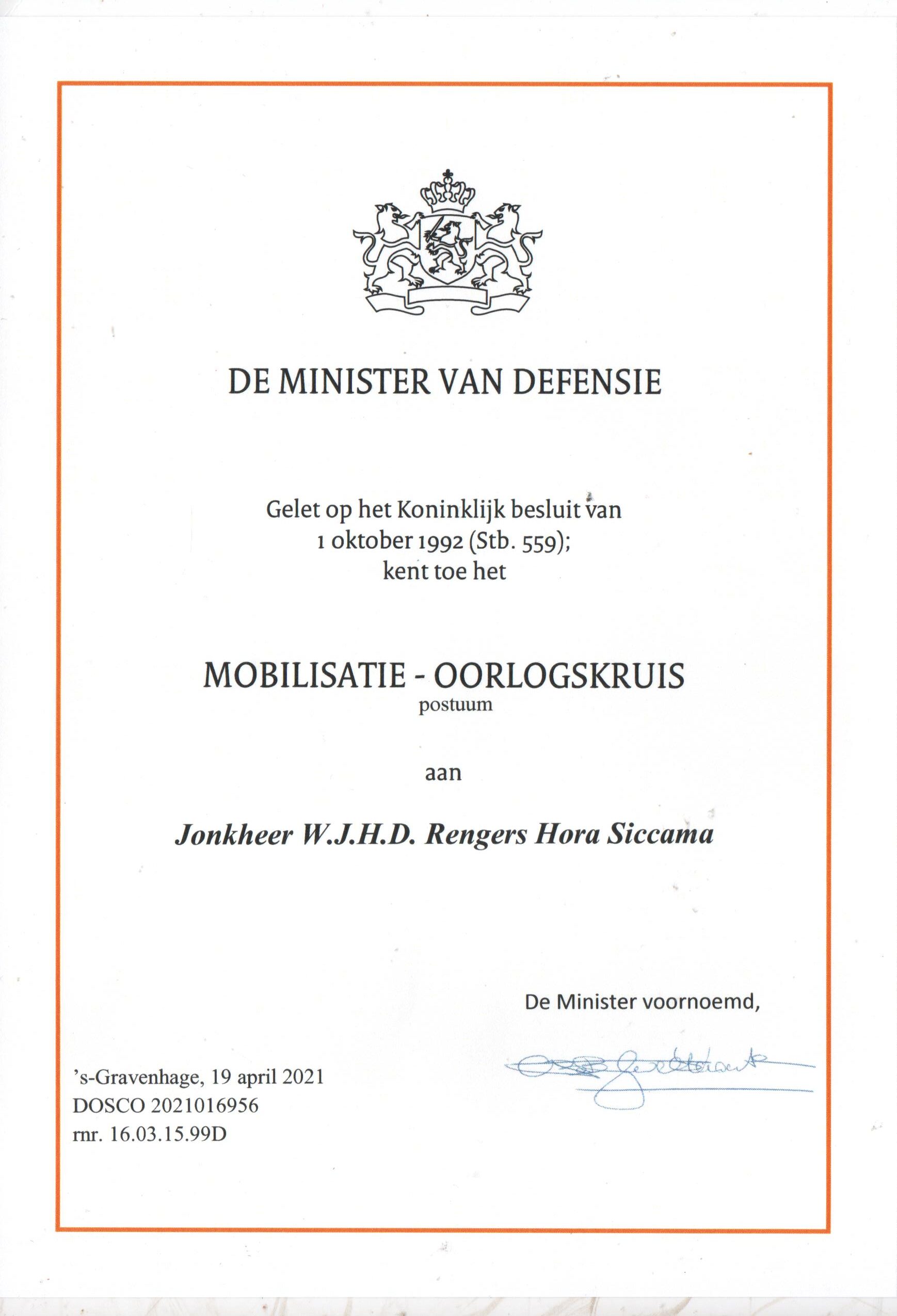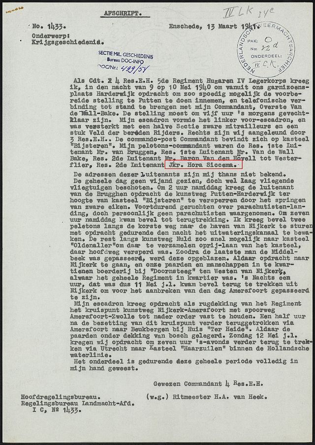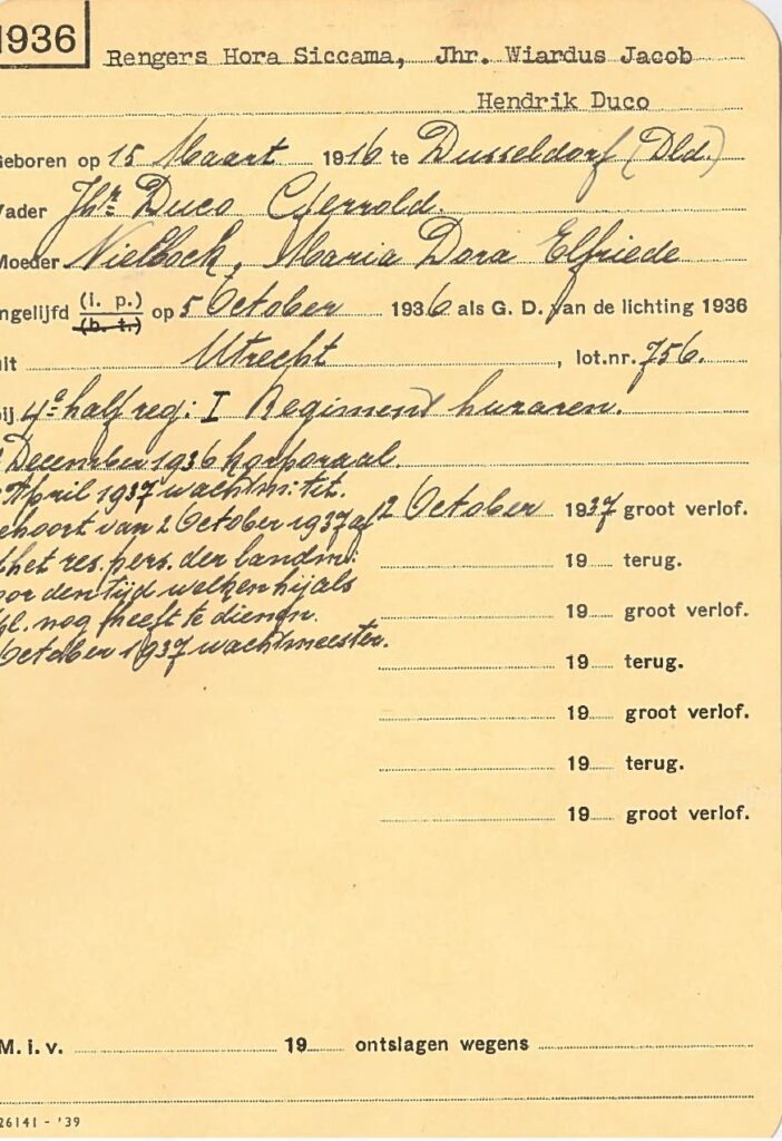 Tijdens de Mobilisatie van 1939-1940 word Rengers Hora Siccema ingedeeld bij het 4e eskadron van het 5e regiment huzaren [aldus een stukje vastgelegde krijgsgeschiedenis over de meidagen van 1940] wat als garnizoensstad Harderwijk had.