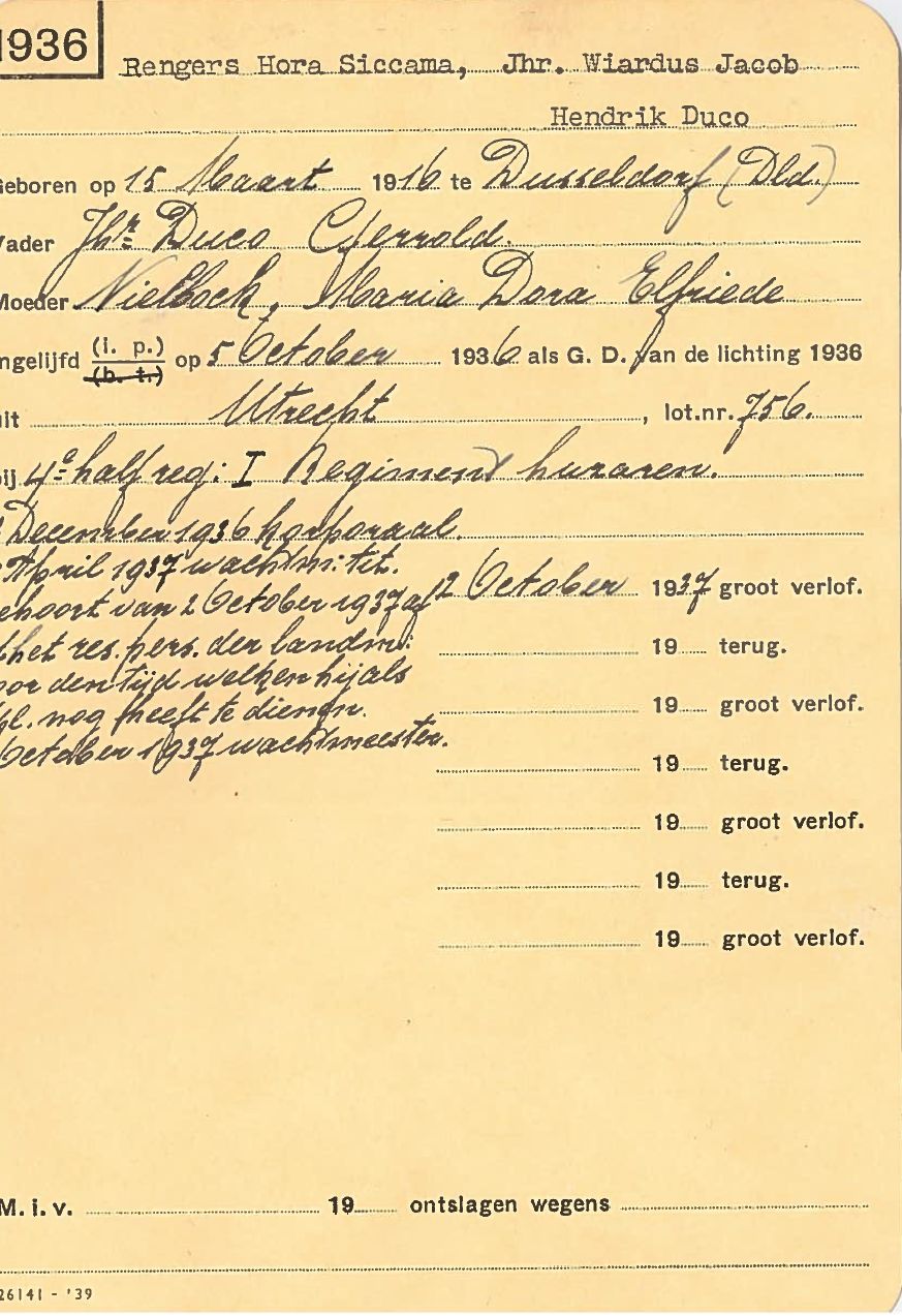Jhr. mr. Wiardus Jacob Hendrik Duco Rengers Hora Siccama (1916-1945) werd geboren op 15 maart 1916 te Düsseldorf.