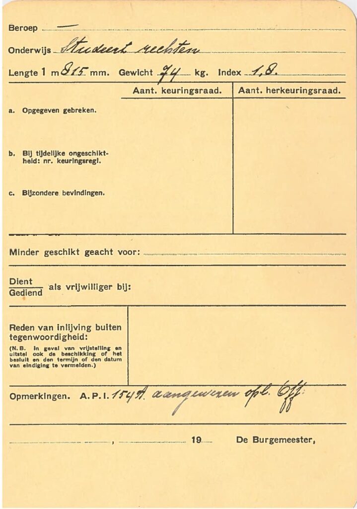 Hij studeerde rechten aan de universiteit van Utrecht. Op 5 oktober 1936 begint hij aan zijn dienstplicht hij wordt opgeroepen om deel te nemen aan de 20ste cursus bij de School Reserve Officieren Cavalerie (SROC), van oktober 1936 tot juli 1937.