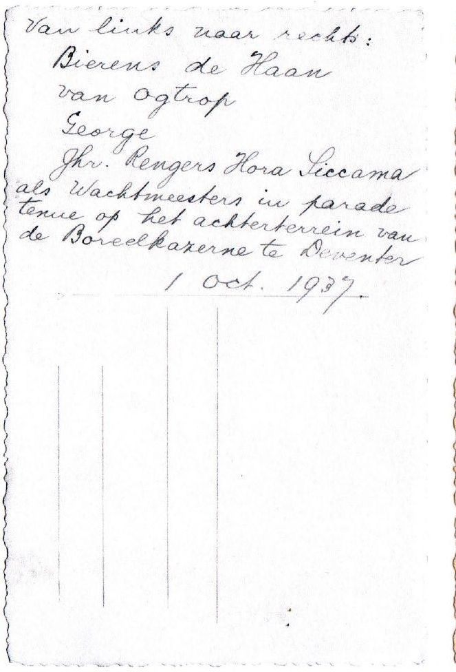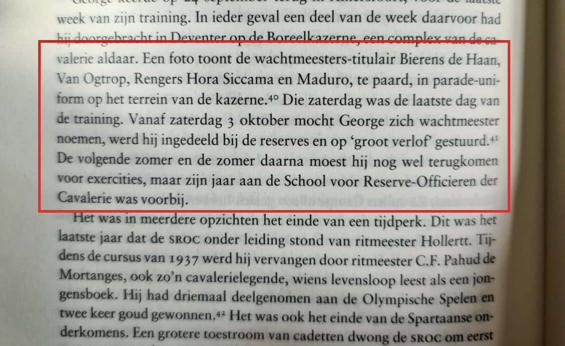 Daarna zullen hij en zijn 25 medeleerlingen drie maanden doorbrengen als pelotonscommandanten. Een van die medeleerlingen is George Maduro. Die in tenminste een van zijn 46 brieven die hij tijdens zijn diensttijd schreef naar huis over Rengers Hora Siccama verteld.